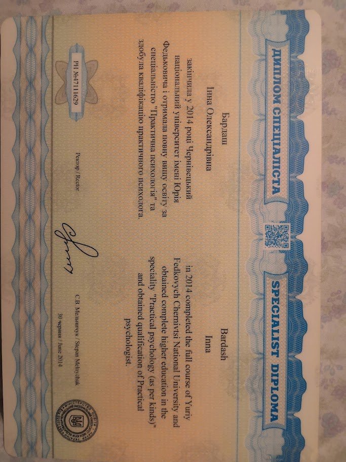 Повна вища освіта ЧНУ їм Ю. Федьковича, спеціальність "практичний психолог"