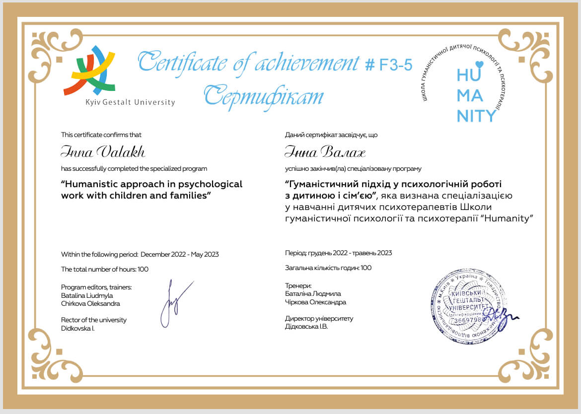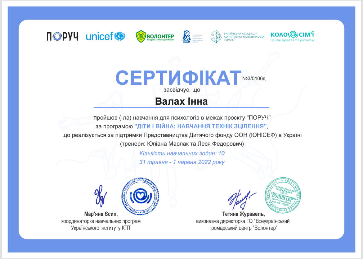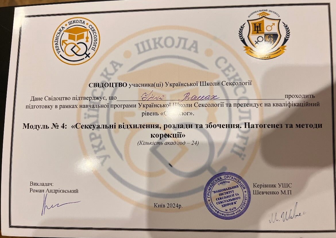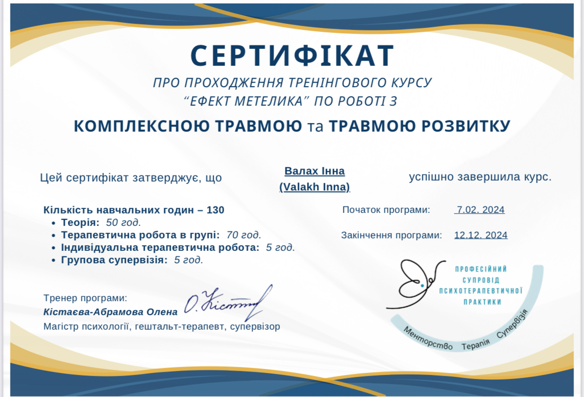 Робота з травмою та ПТСР з вересня 2021 - липень 2022, схемо терапія 2024,Дитяча психологія з квітня 2022 - грудень 2023 ,2-й ступінь Гештальт терапії та психодрами - Харків з 2018 по теперішній час.