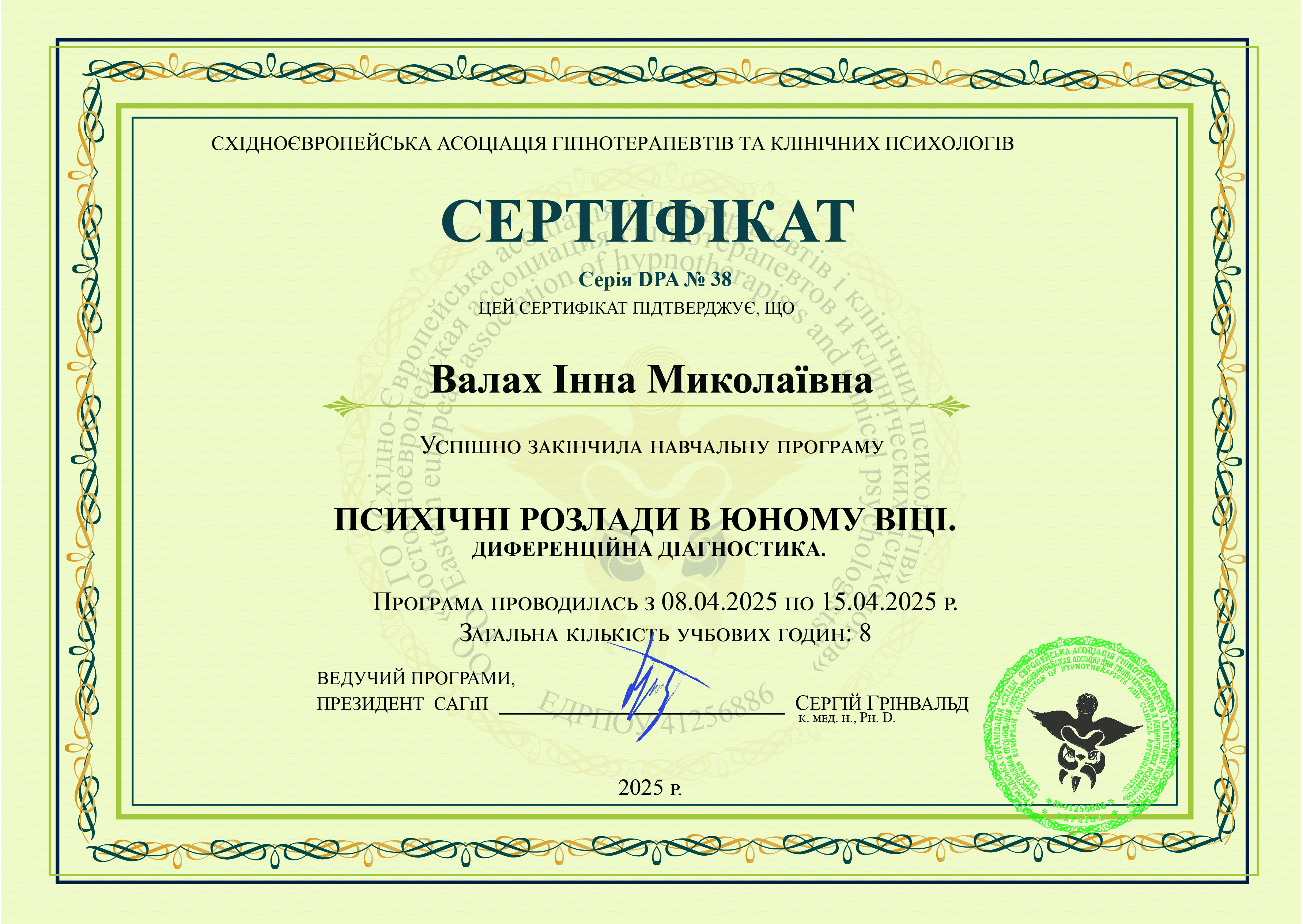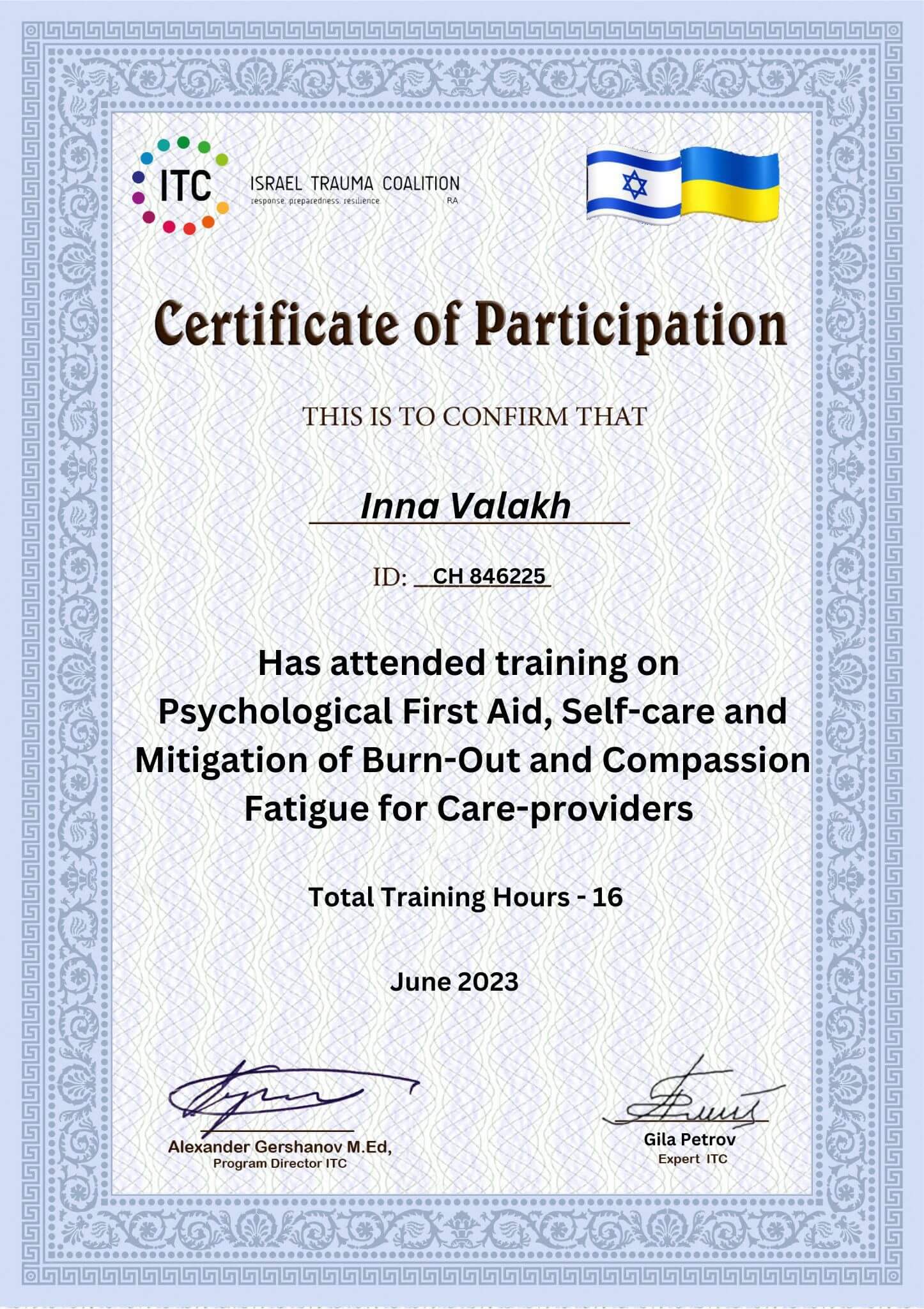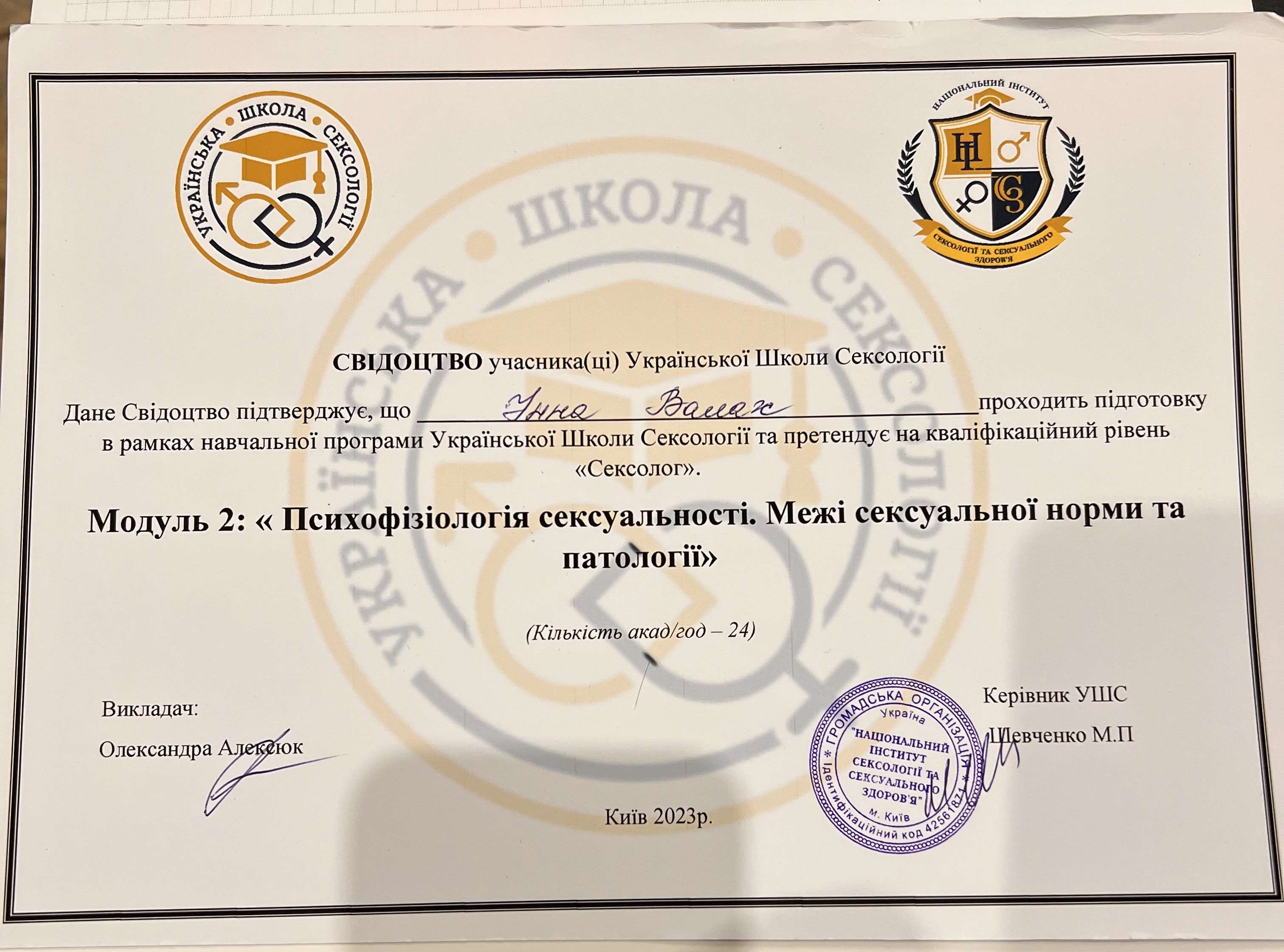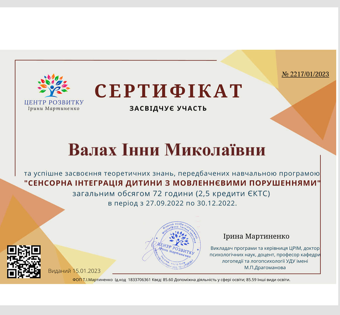 Робота з травмою та ПТСР з вересня 2021 - липень 2022, схемо терапія 2024,Дитяча психологія з квітня 2022 - грудень 2023 ,2-й ступінь Гештальт терапії та психодрами - Харків з 2018 по теперішній час.