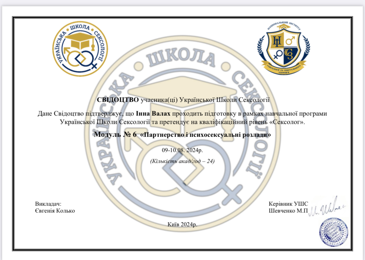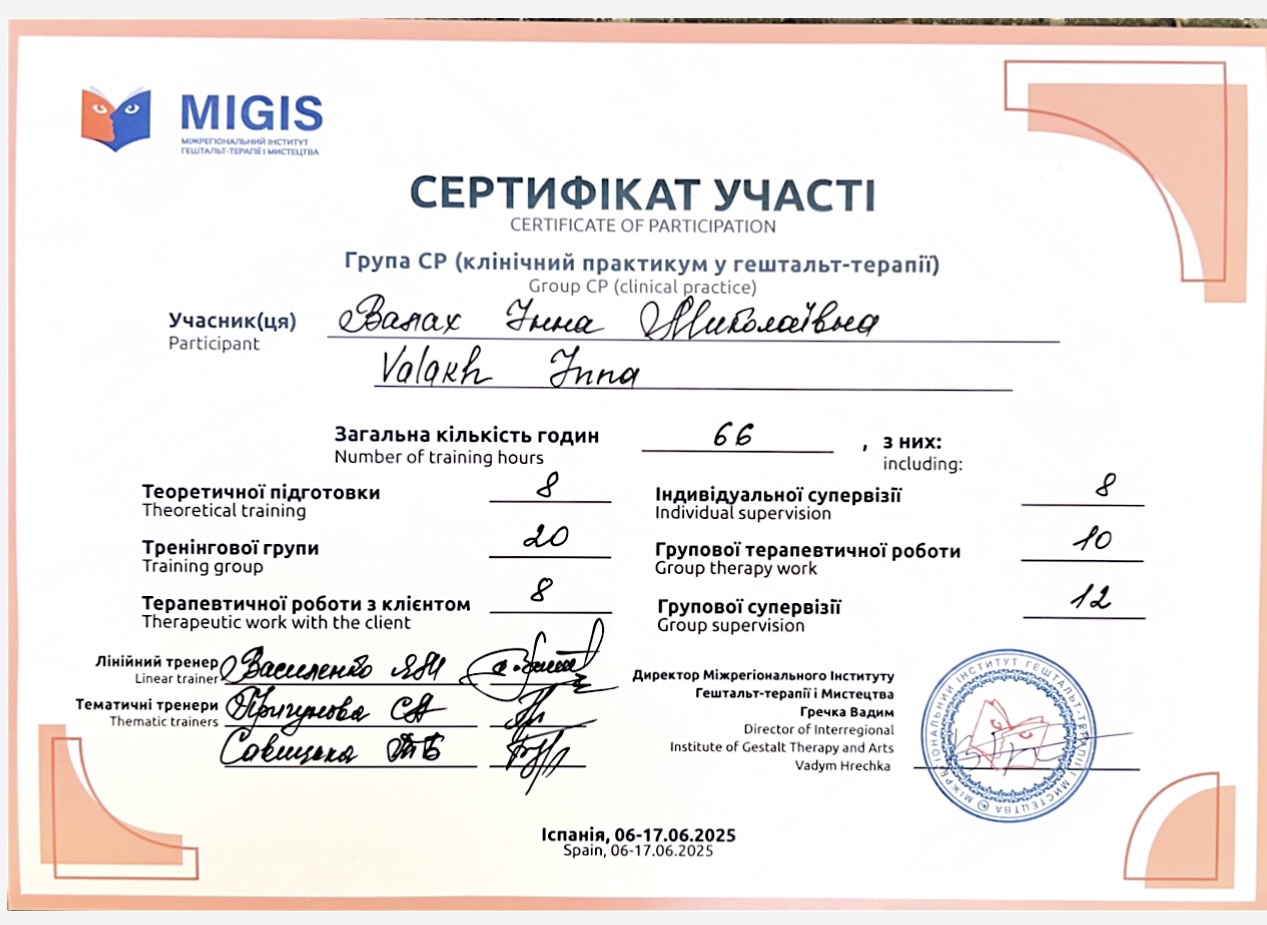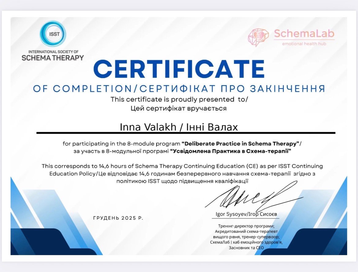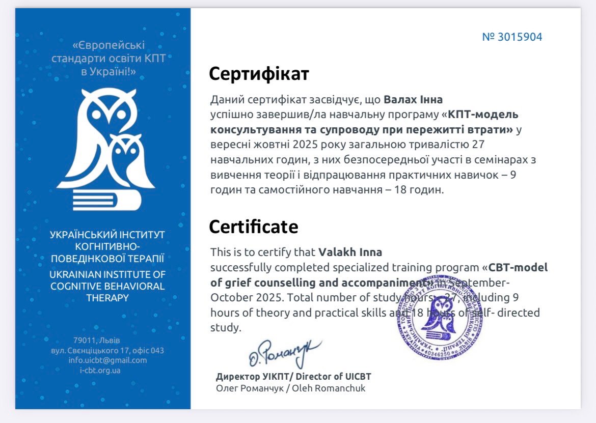 Закінчила 2-б ступінь "Я практичний психолог". З вересня проходитиму спеціалізацію-роботу з травмою та ПТСР.