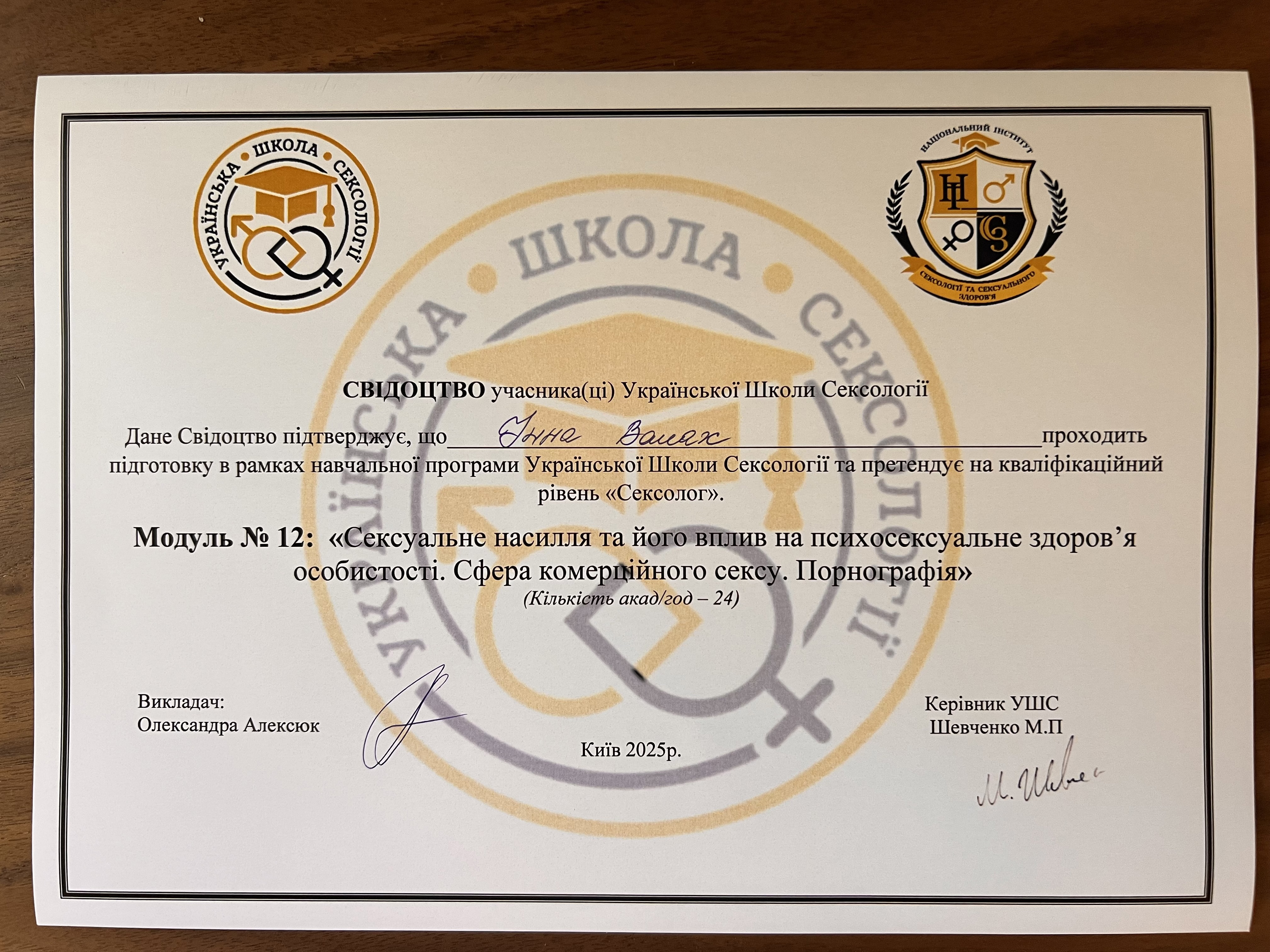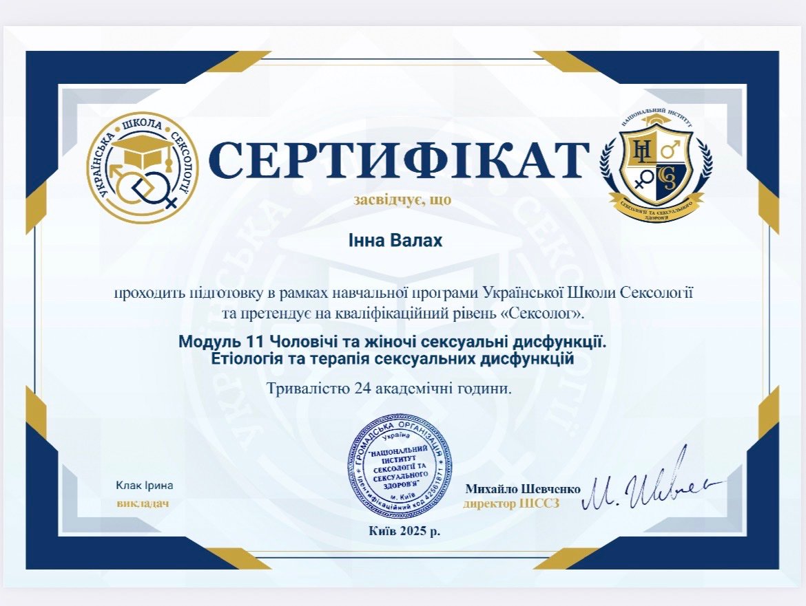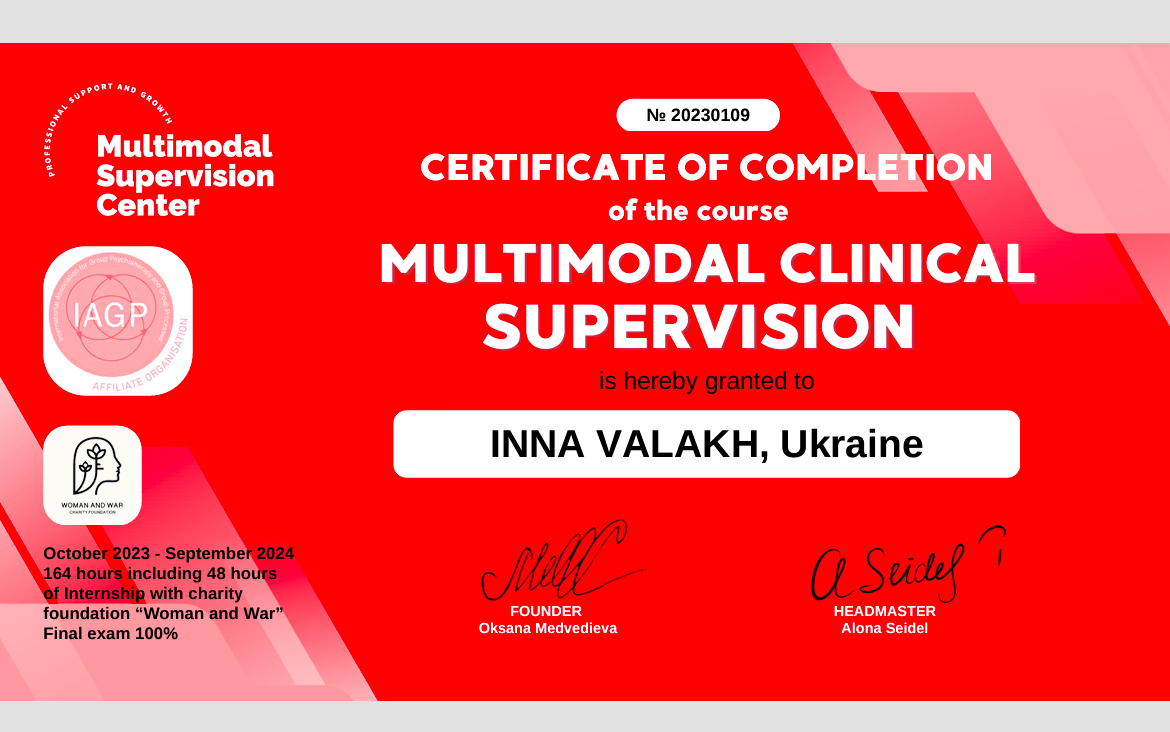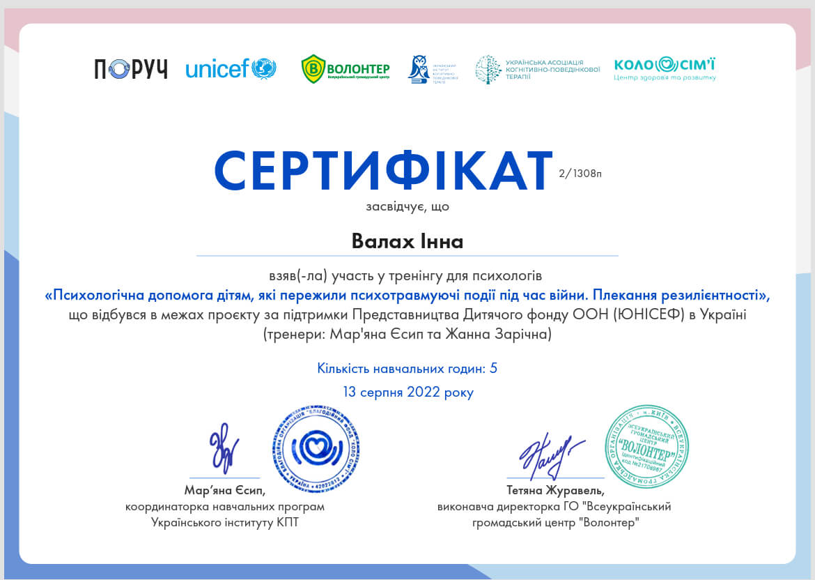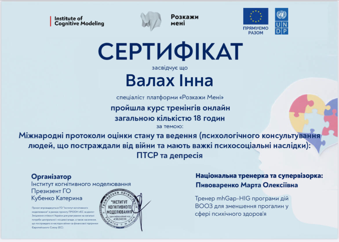 Закінчила 2-б ступінь "Я практичний психолог". З вересня проходитиму спеціалізацію-роботу з травмою та ПТСР.
