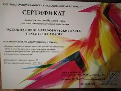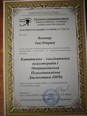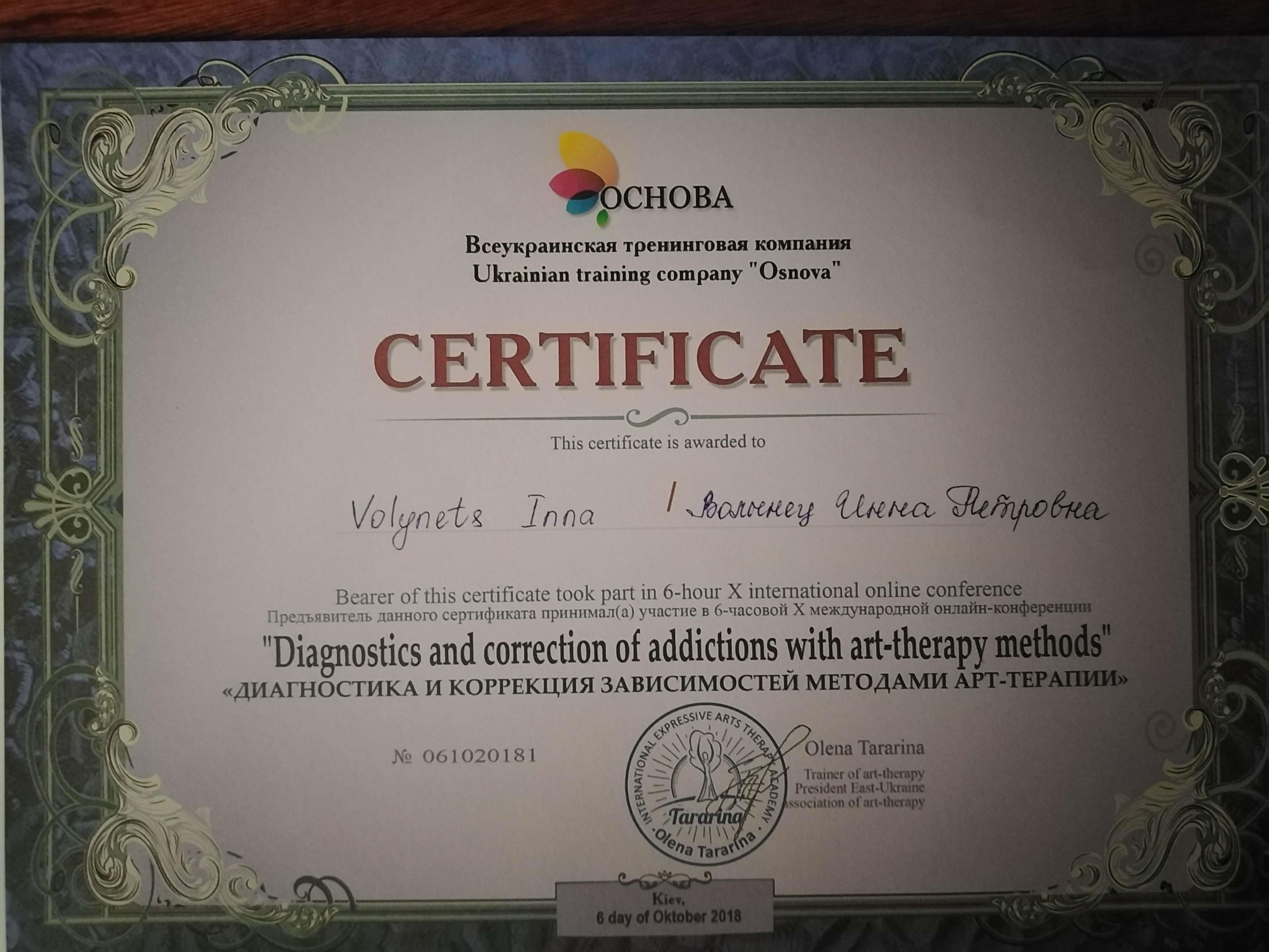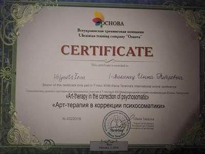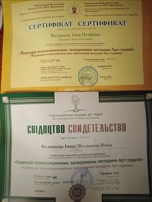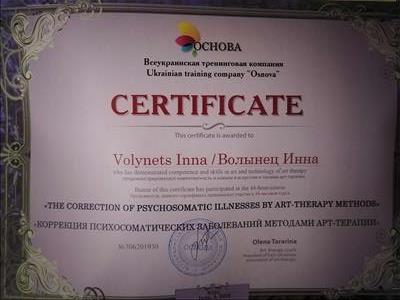 Тілесно-орієнтований психотерапевт, арт-терапнвт, сертифікований тренер. У роботі використовую метафоричні асоціативні карти (пройшла повний курс навчання по роботі з МАК). За медінституту пройшла навчання по роботі з ПТСР тілесно-орієнтованими техніками, вивчала психосоматику. Тілесно-орієнтована психотерапія навчалася і у психологів, і у медиків. Постійно проходжу навчання, беручи участь у різноманітних навчальних проектах, семінарах, фестивалях, тренінгах.