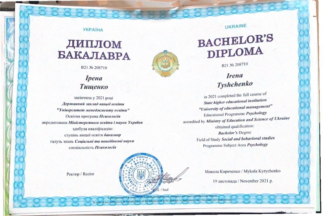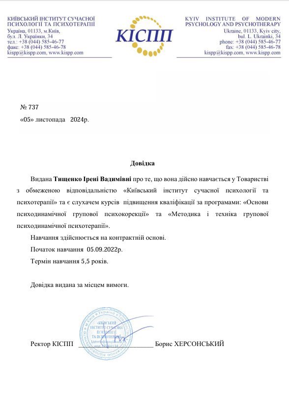 Я є клінічним психологом та психоаналітиком в навчанні. Цього року закінчую магістратуру в університеті Шевченка та сертифікатну програму з кризових консультацій. Навчання класичному психоаналізу та психоаналітичній психотерапії почалося в 2020 році, а закінчиться в 2027. Працюю з дорослими індивідуально та в групах.