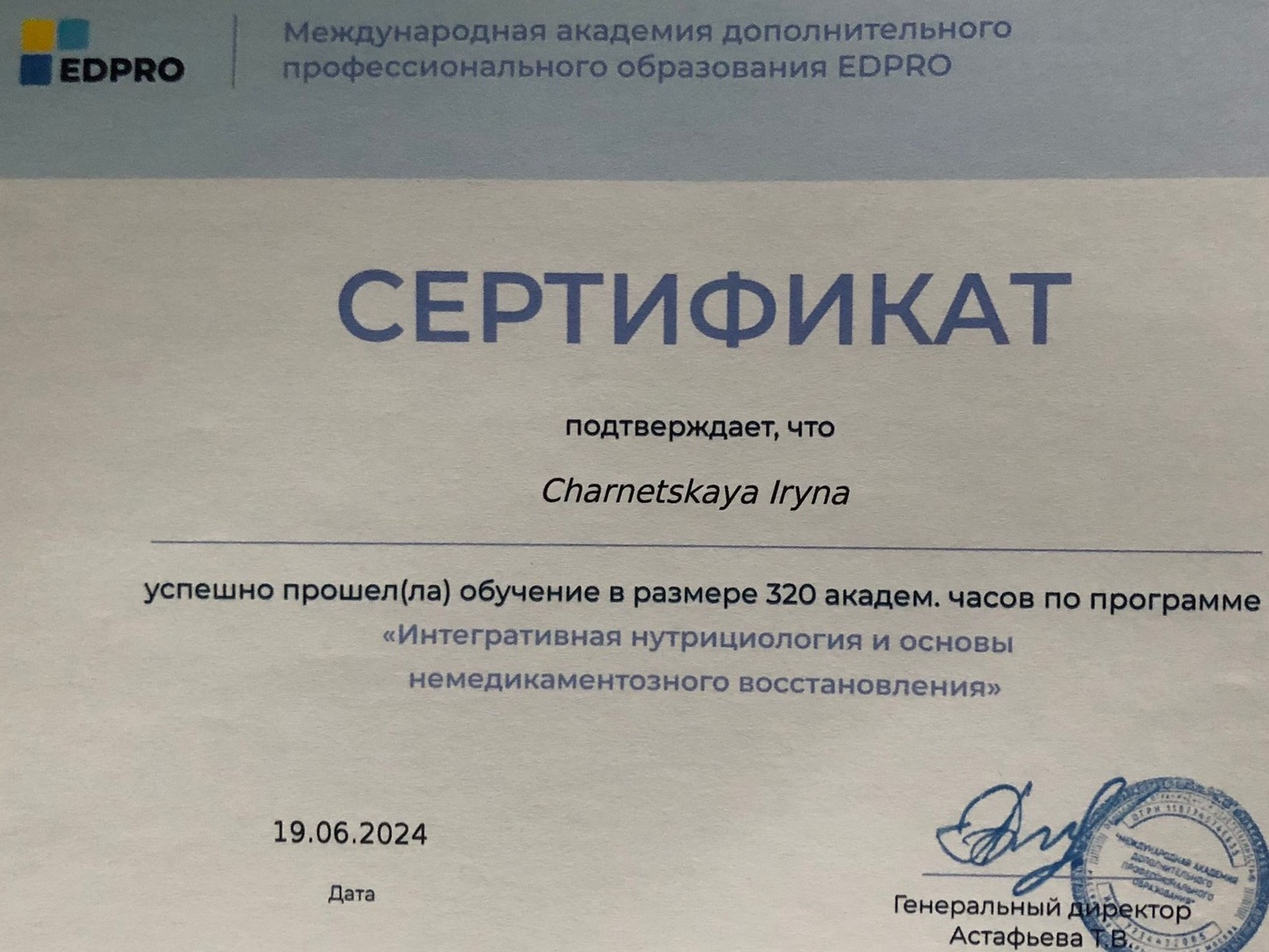 •2024 – Міжнародна академія додаткової професійної освіти EDPRO, 320 годин «Інтегративна нутриціологія та основи немедикаментозного відновлення»