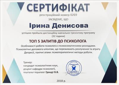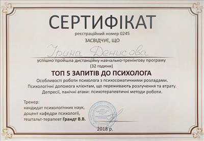 – Запорізький національний університет. Центр психологічного здоров'я та психосоціального супроводу (м. Запоріжжя) "ТОП-5 запитів до психолога: психосоматичні розлади, розлучення, втрати, депресії, панічні атаки" (2 місяці)