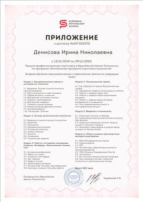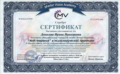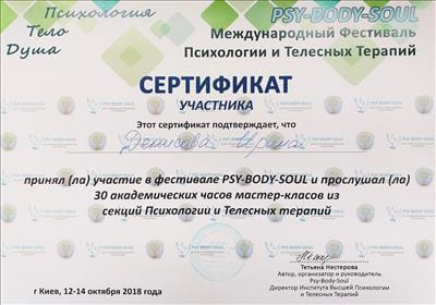 - Академія "Master Vision" (м. Тюмень) "Психотерапія за методом роботи з метафоричними асоціативними картами" (2 місяці)