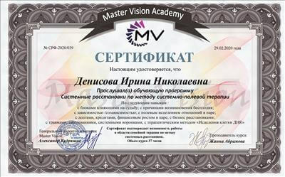 - Академія "Master Vision" (м. Тюмень) "Системні сімейні розстановки з Б. Хеллінгера" (2 місяці)