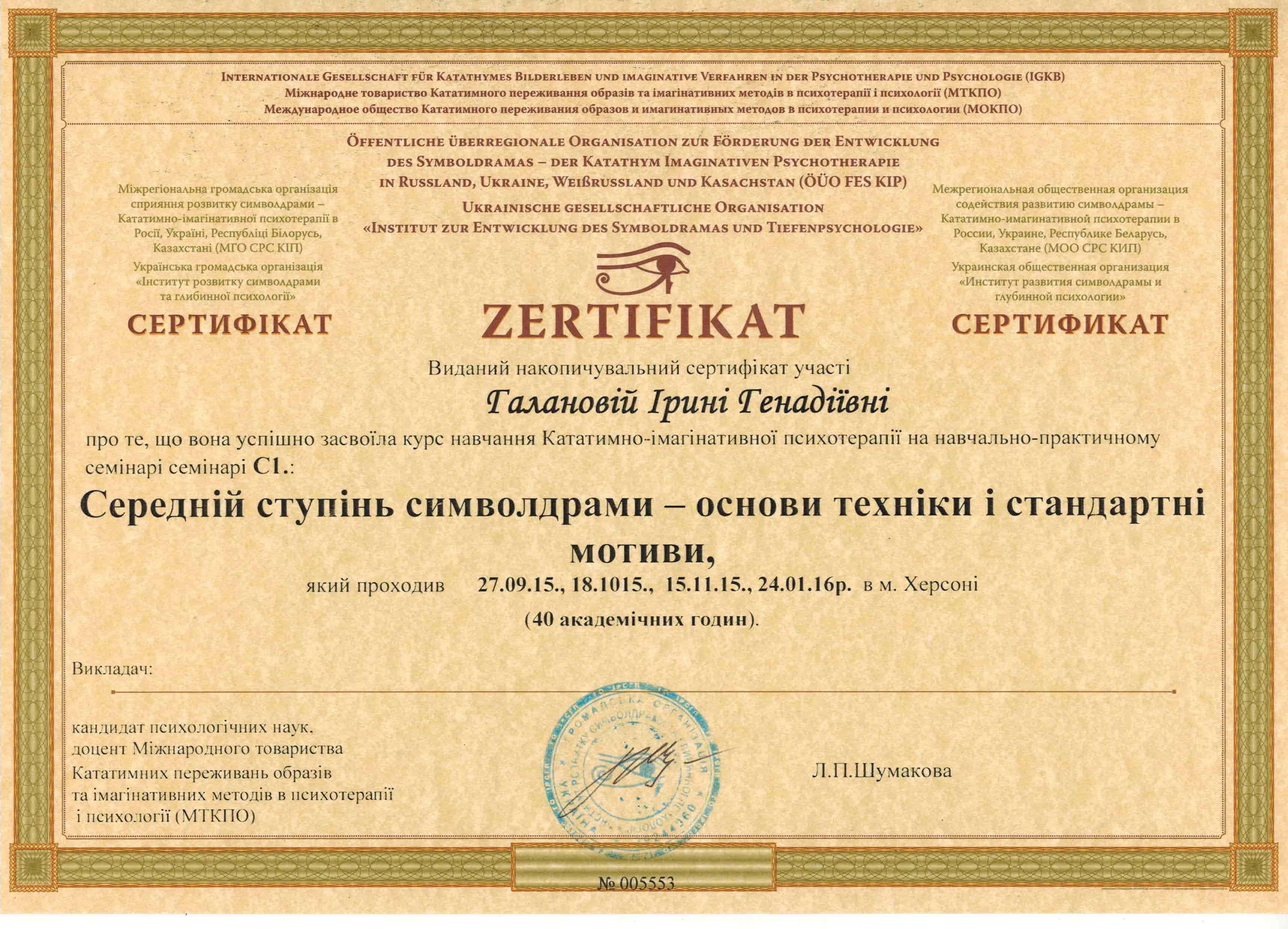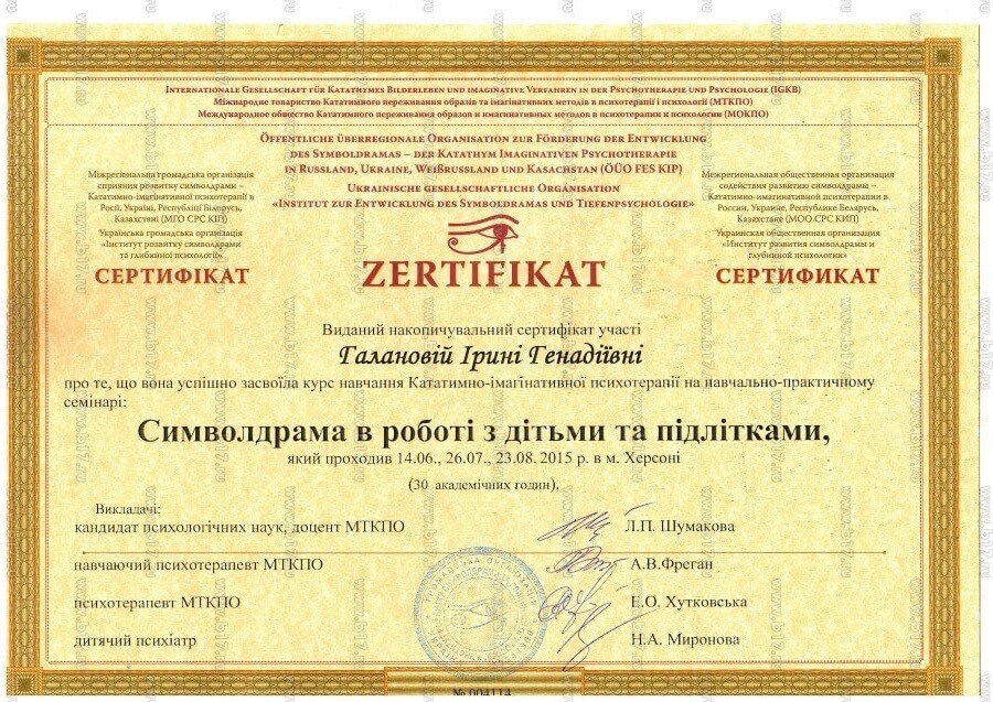 Перша моя освіта - економична. Бажання покращити своє життя привело мене до того, що я отримала освіту психолога, а потім обрала напрям для подальшого начання - Символдраму. Чому саме цей напрямок? Буває, що людині складно описати свої почуття словами, висловити ставлення до якогось питання. У цьому випадку найбільш ефективною стає техніки Символдрами -уявлення образу (мотиву) на задану тему. Несвідоме говорить з нами мовою символів, метафор.Такі візуальні образи-це не спогади, не фантазії, які можна усвідомлено контролювати, а продукт несвідомого.