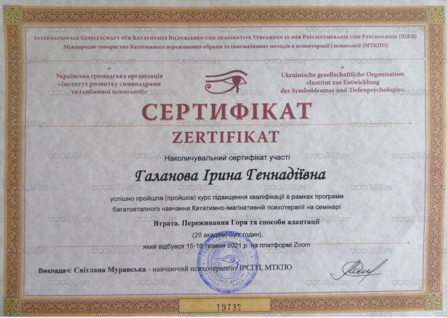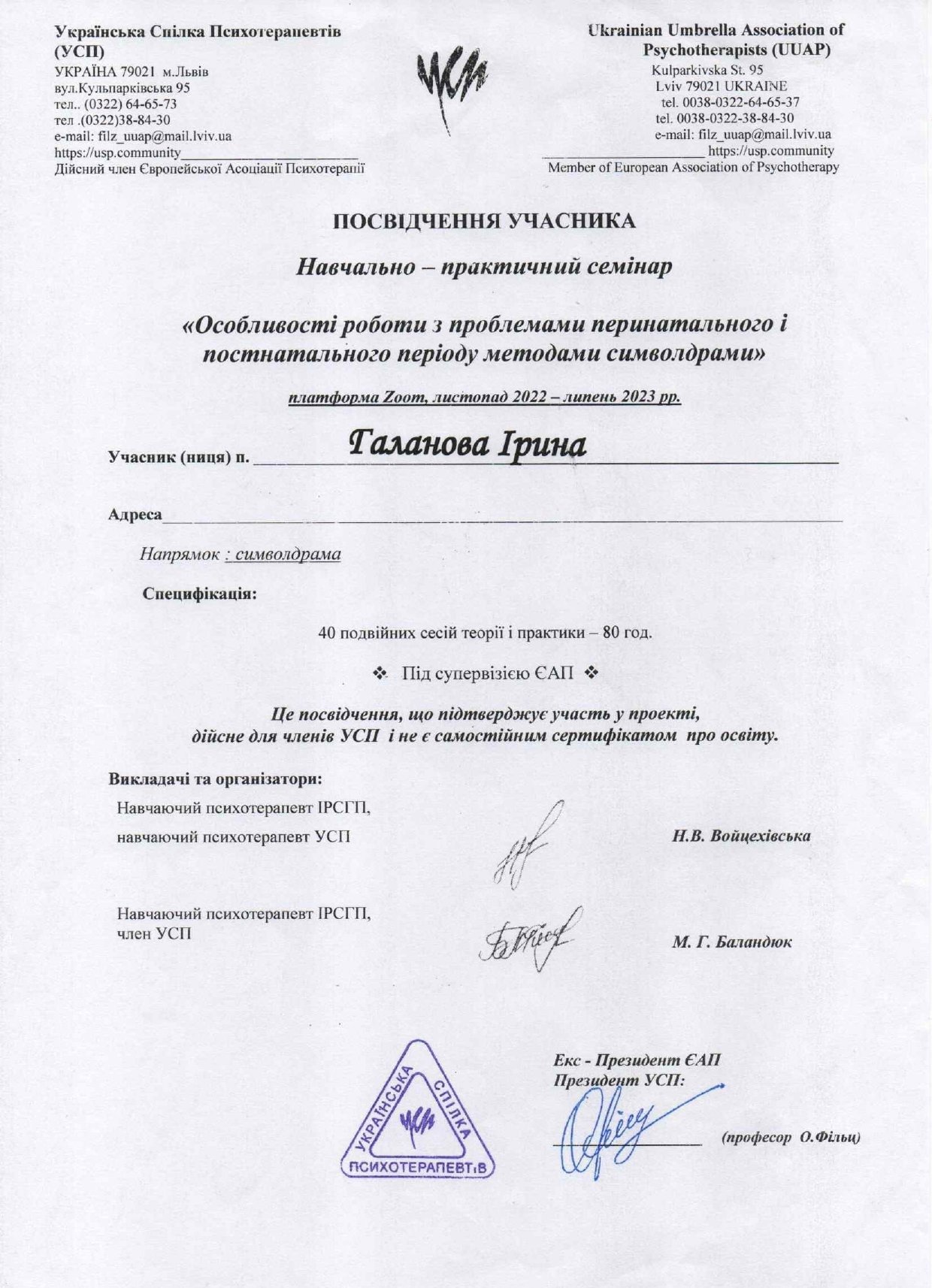 Психолог, коуч, закінчую навчання на психотерапевта у методі Кататимно-імагінативної психотерапії (Символдрама).