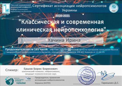 – ГО «Київський інститут раціонально-інтуїтивної психотерапії «Я». Нейропсихологічна діагностика та корекція у дитячому віці. 2018р.
