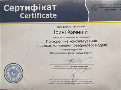 – ГО «Київський інститут раціонально-інтуїтивної психотерапії «Я». Психологічне консультування у рамках КПТ. 2020р.