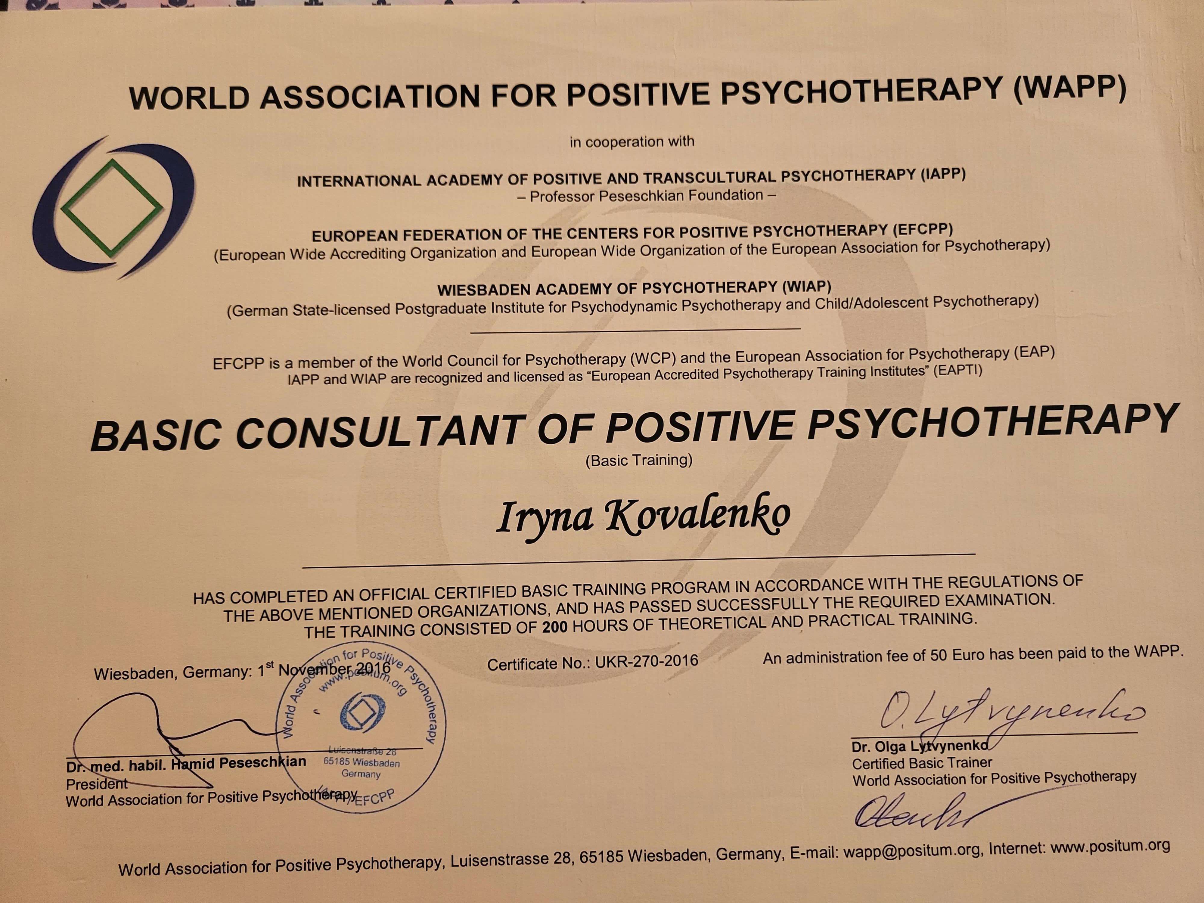 BASIC CONSULTANT OF POSITIVE PSYCHOTHERAPY (Basic Training)