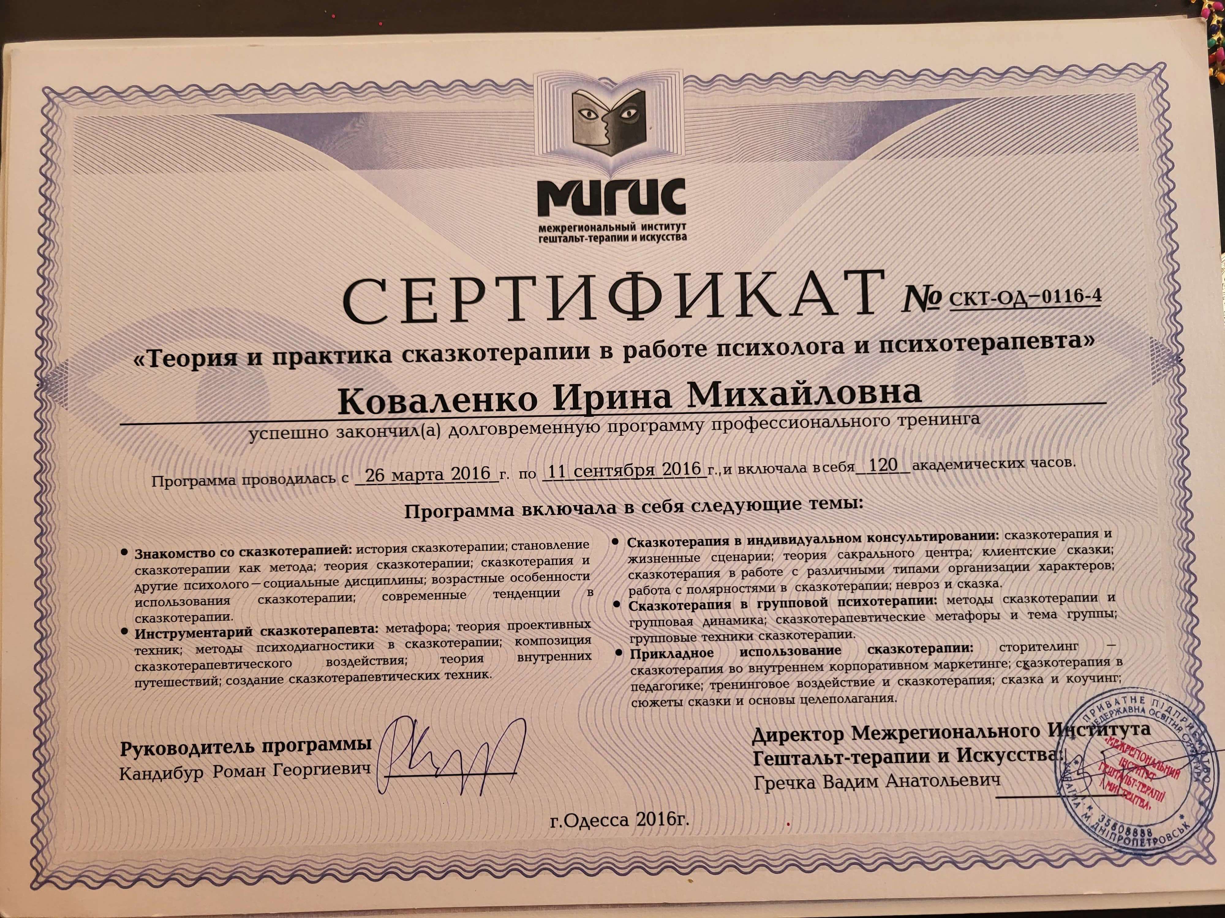 Добре працює із запитами криз у відносинах та проблем із самоцінкою. Створює доброзичливу атмосферу на терапевтичних сесіях. Уважна, емпатична, професійна. Ірина, як людина, відкрита, товариська і доброзичлива. Вміє ділитися та вислухати, прийняти. Як психолог - точно знаходить чітку межу між прийняттям, почуттям іншого та об'єктивним баченням ситуації.