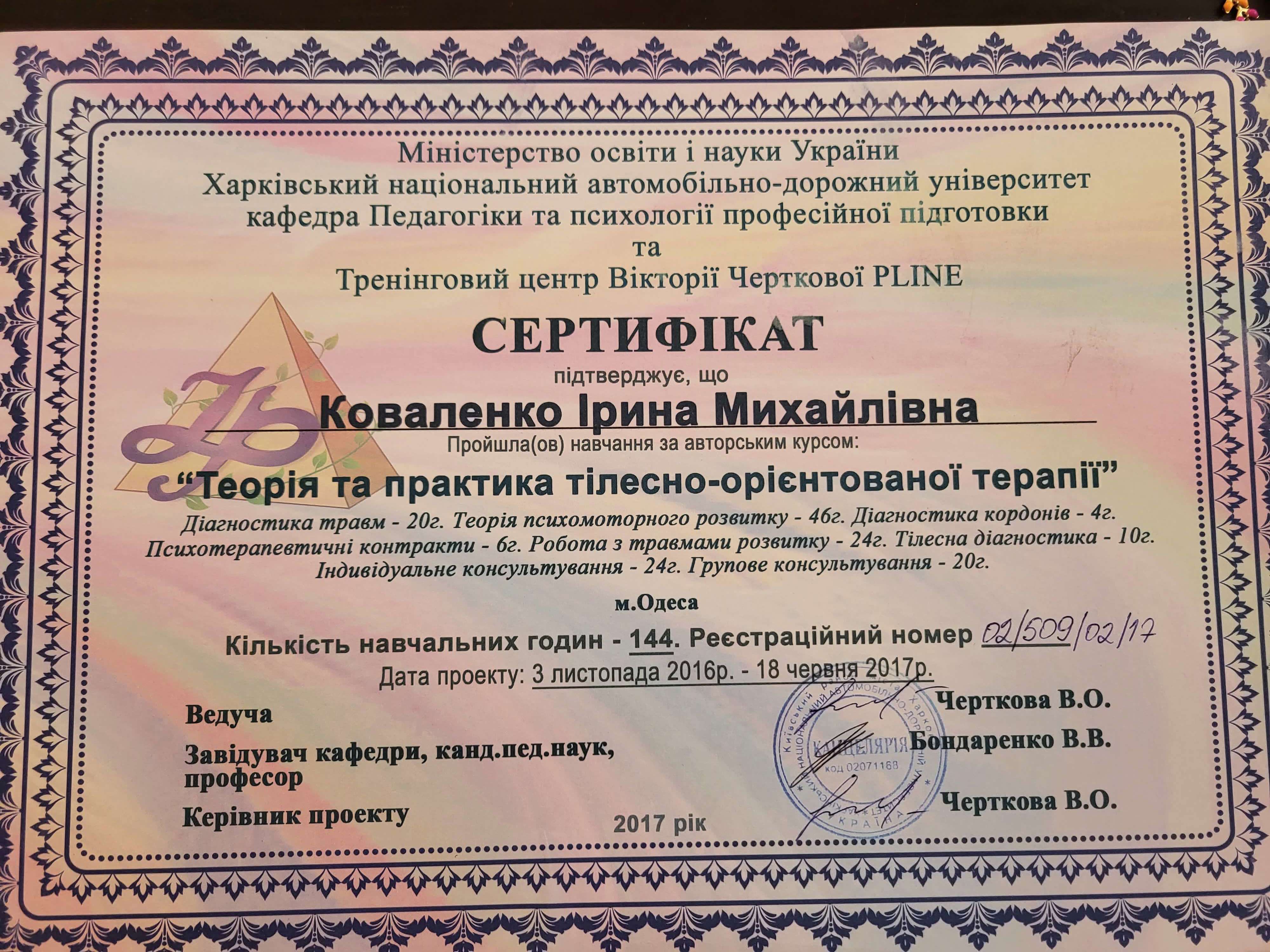 ОНУ ім. Мечникова, спеціальність: клінічна психологія. ОНУ ім. Мечникова, підвищення кваліфікації: робота з ПТСР, НЛП-практик. Тілесно-орієнтована терапія, Вісбаденська Академія Позитивної психотерапії, Південноукраїнське Психоаналітичне суспільство.