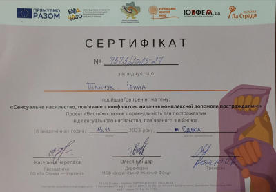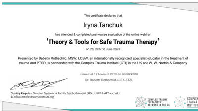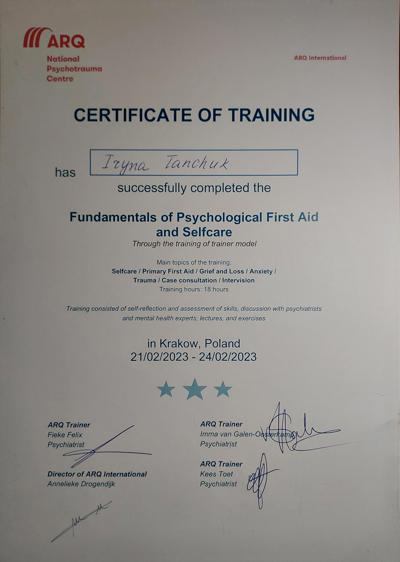 "Основи першої психологічної допомоги та самодопомоги: сомодопомога, перша психологічна допомога, втрата та горювання, тривожність, травма, кейс консультування, інтервізія", 2023, ARK, Польща