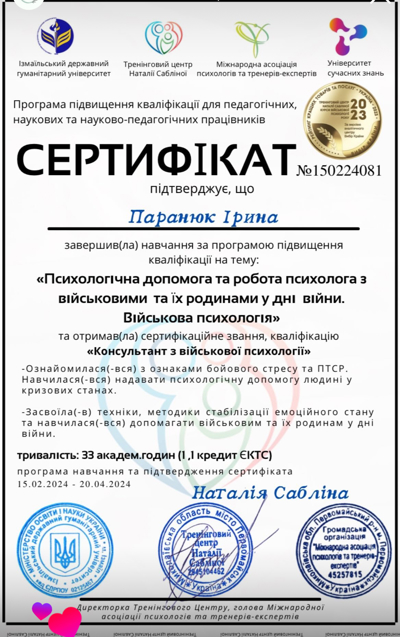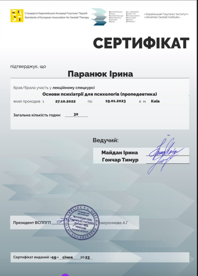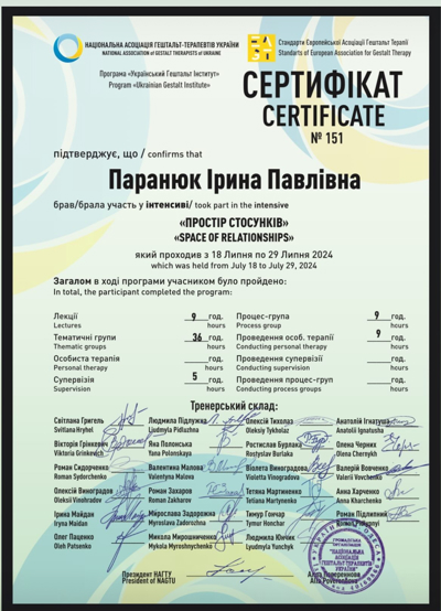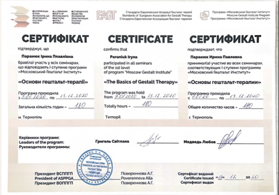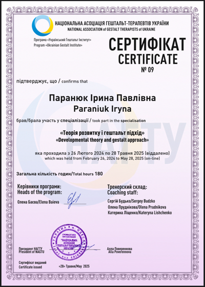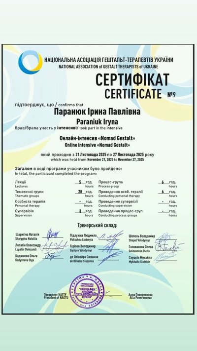 Завершила 1,2 ступінь гештальт терапія НАГТУ