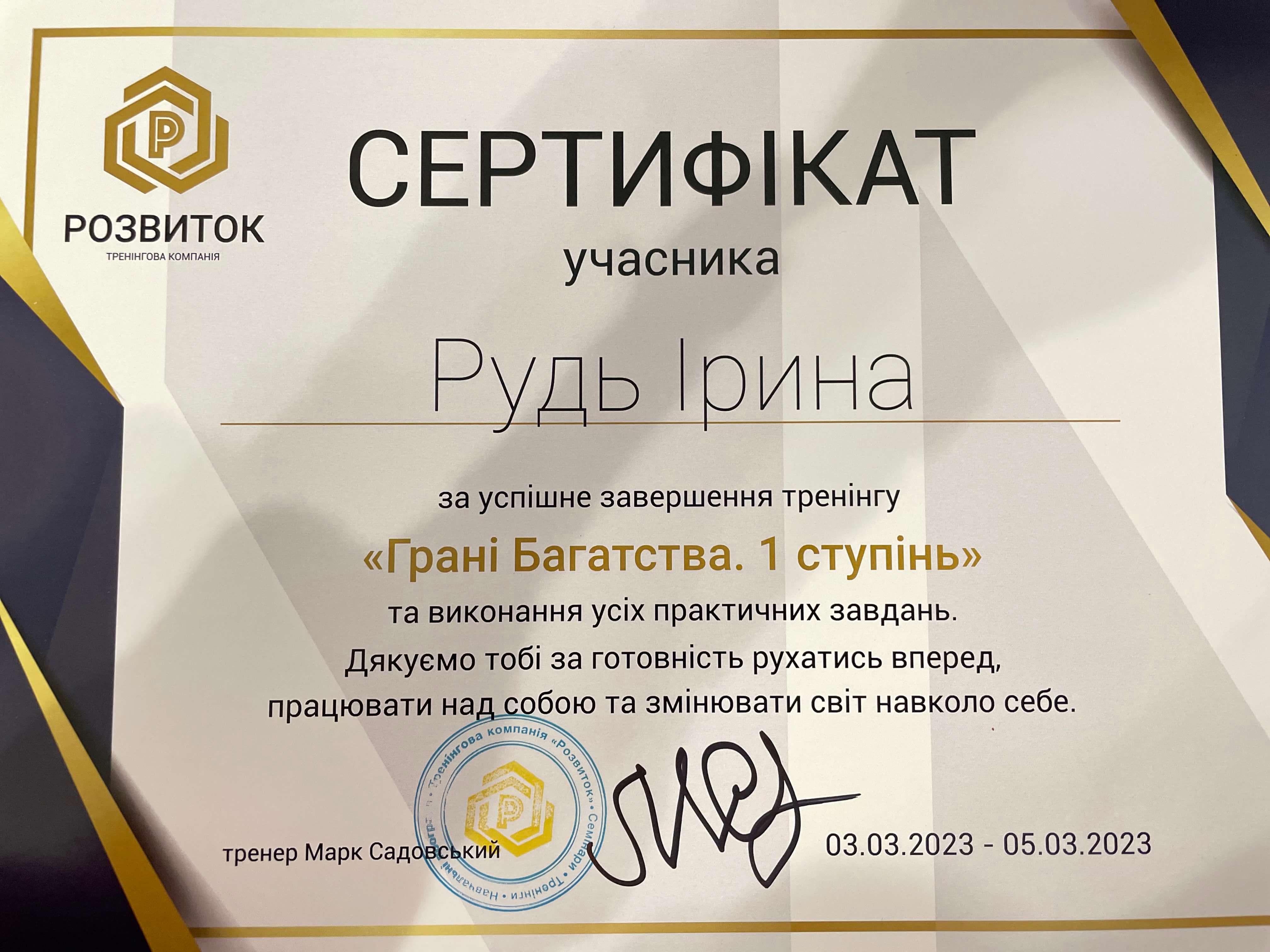 Тернопільський педагогічний університет ім.В.Гнатюка, навчаюсь на 2 ступені гештальт напрямку. Фінансова грамотність. Проходила і проводила тренінги персональної ефективності Лідерстка програма. Ораторське мистецтво. Тренінги по продажах і тайм менеджменту. Тренінг «Трансформація життєвого сценарію», Жіночий шатл. «Ефективний супровід родин, що постраждали від війни. Види втручань». Гештальт інтенсив
