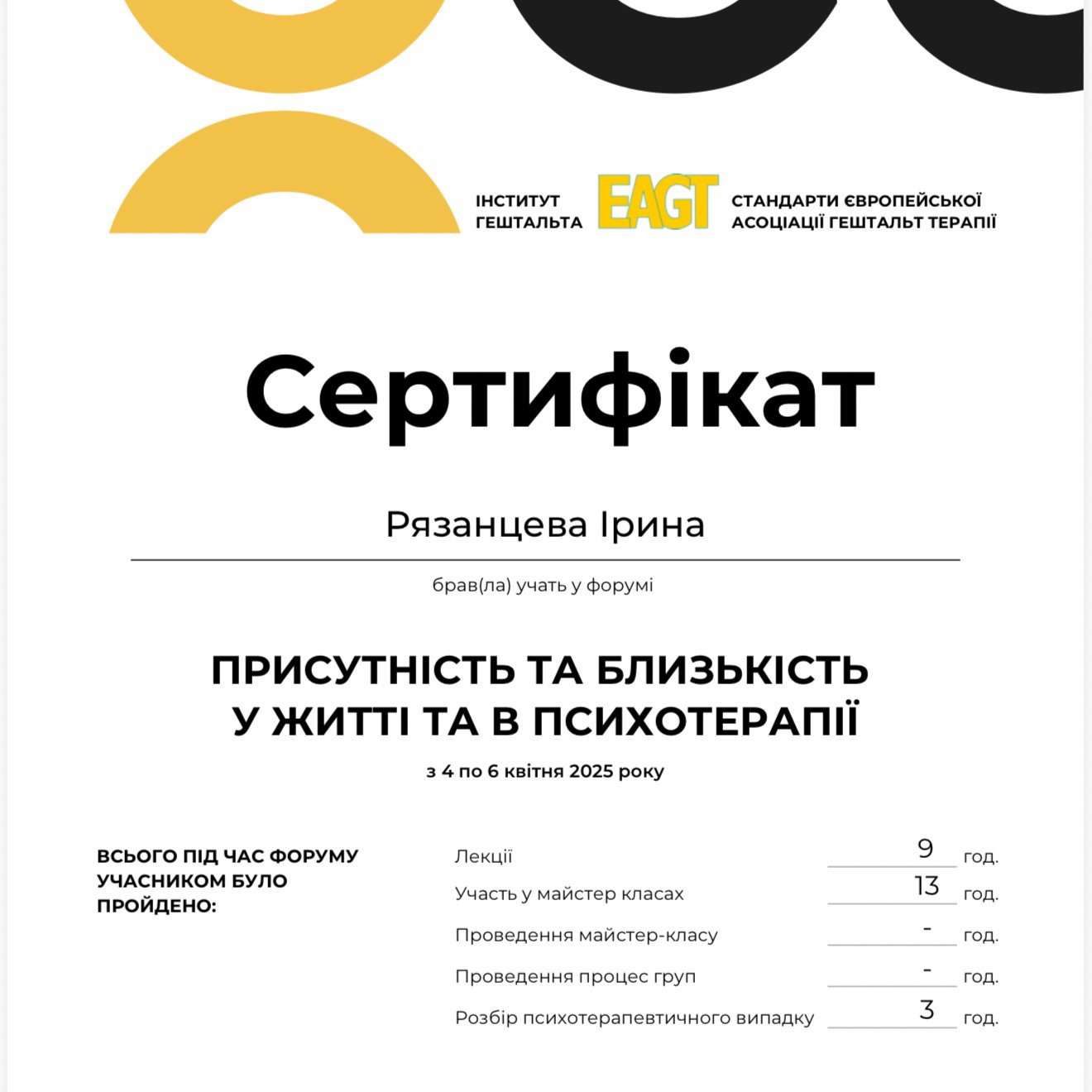Диплом «Теорія та практика гештальт-терапії».