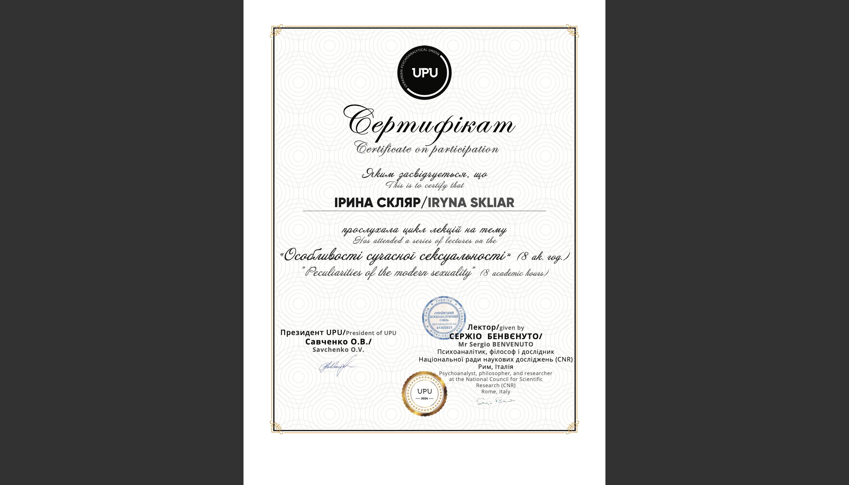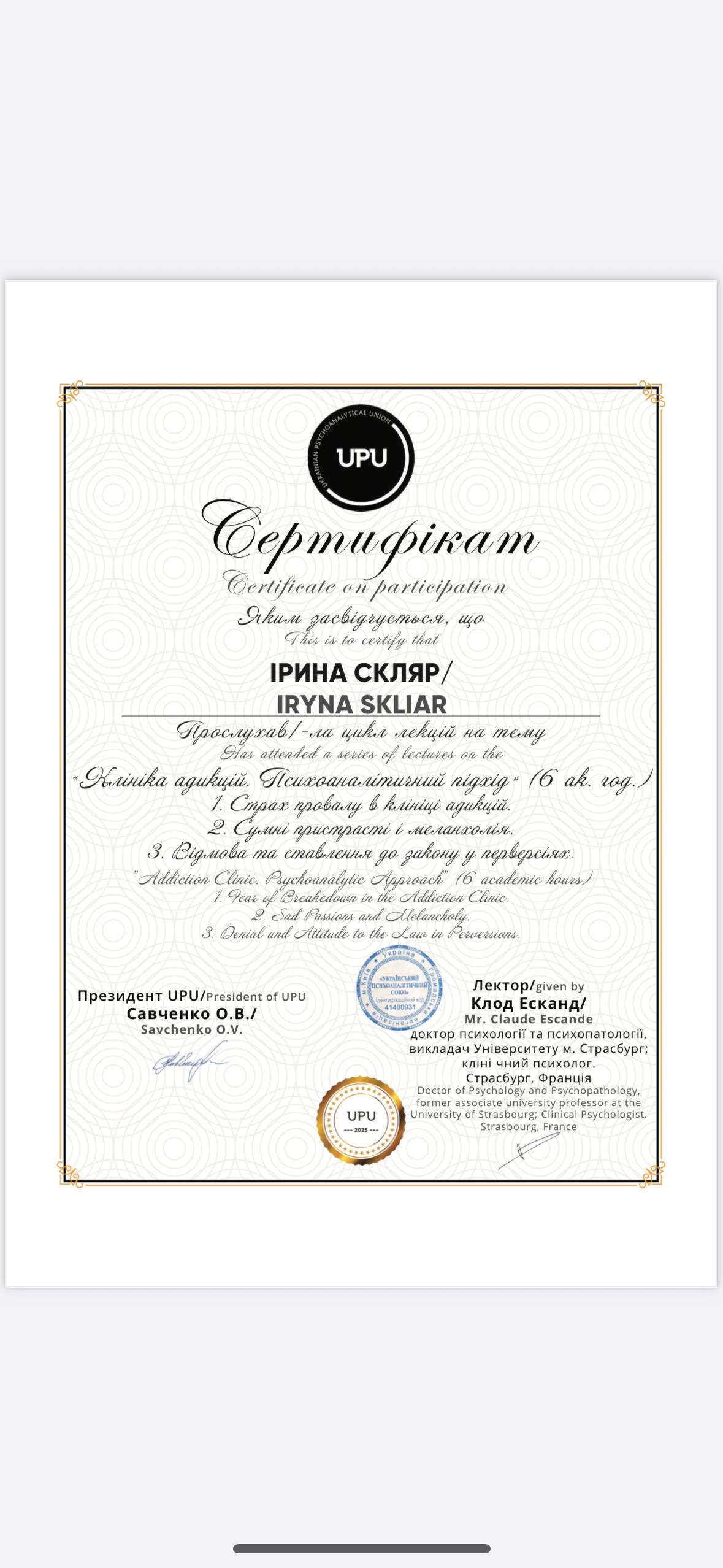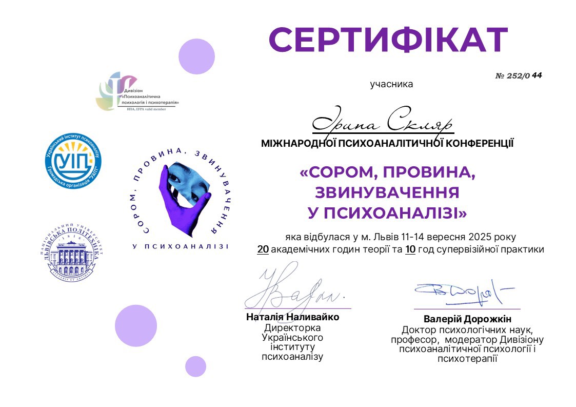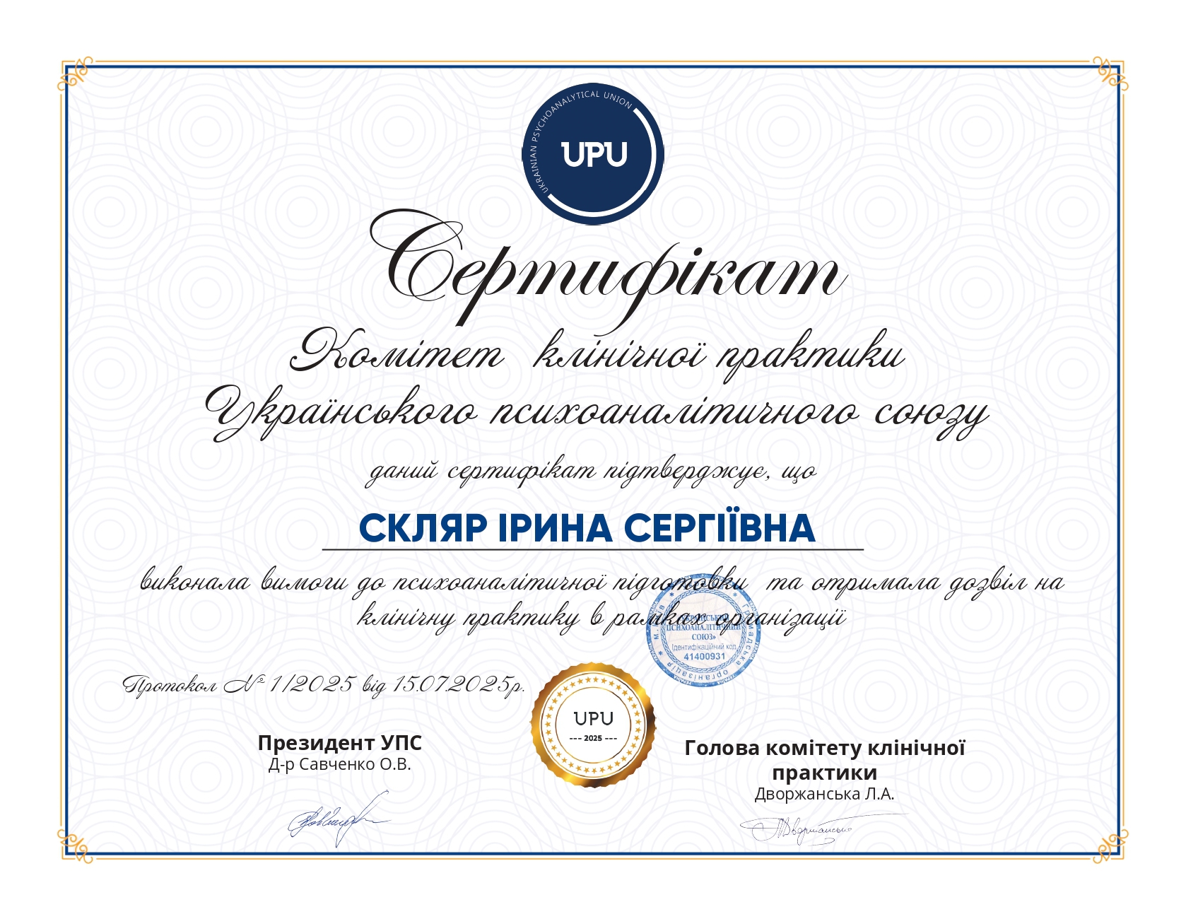 -Приватний ВНЗ «Міжнародній інститут глибинної психології», спеціалізація з клінічного психоаналізу«Клініка відносин»