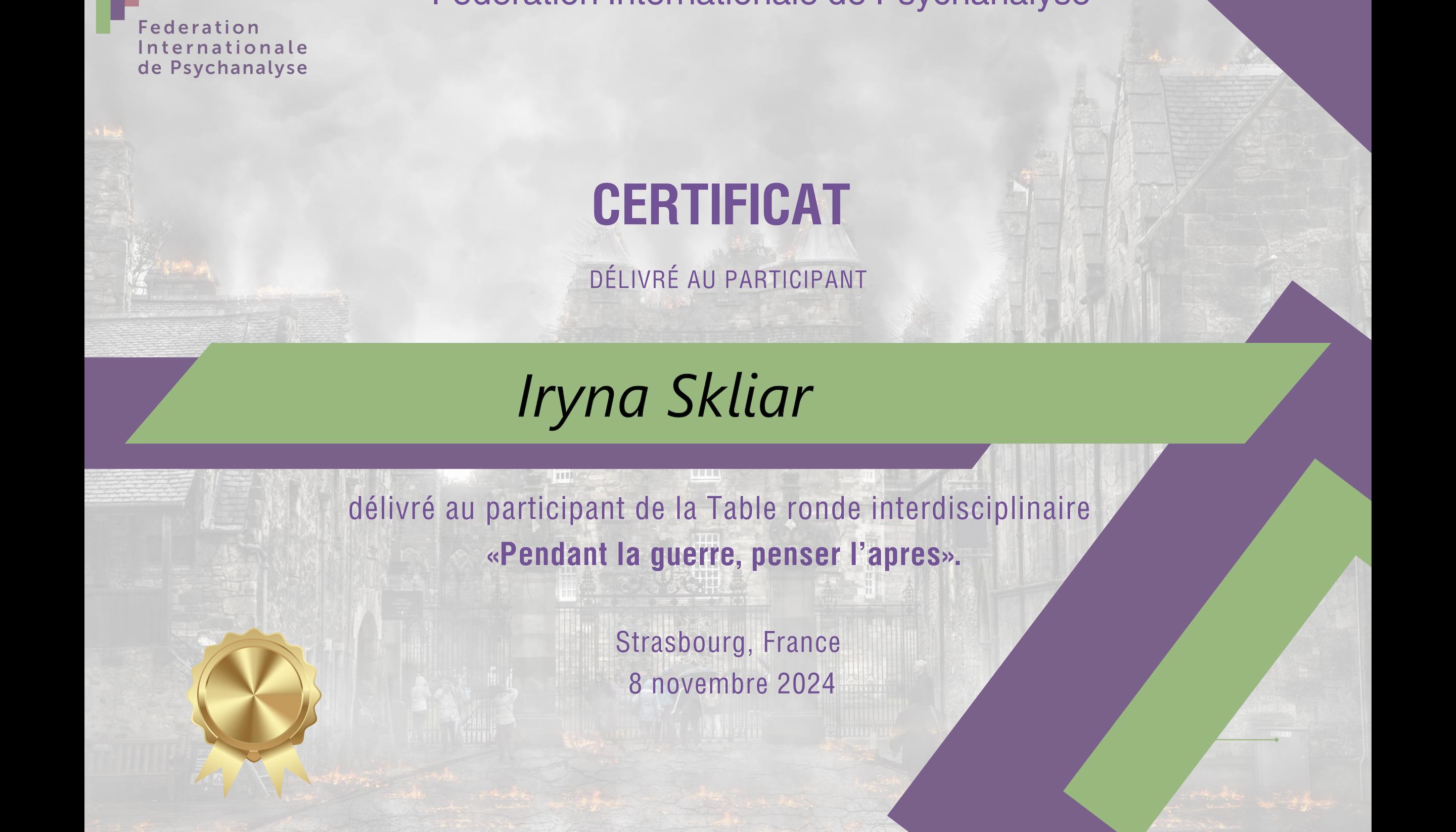 Вітаю. Мене звати Ірина, я практик психоаналізу, дійсна членкиня Української асоціації психоаналізу та Українського психоаналітичного союзу.