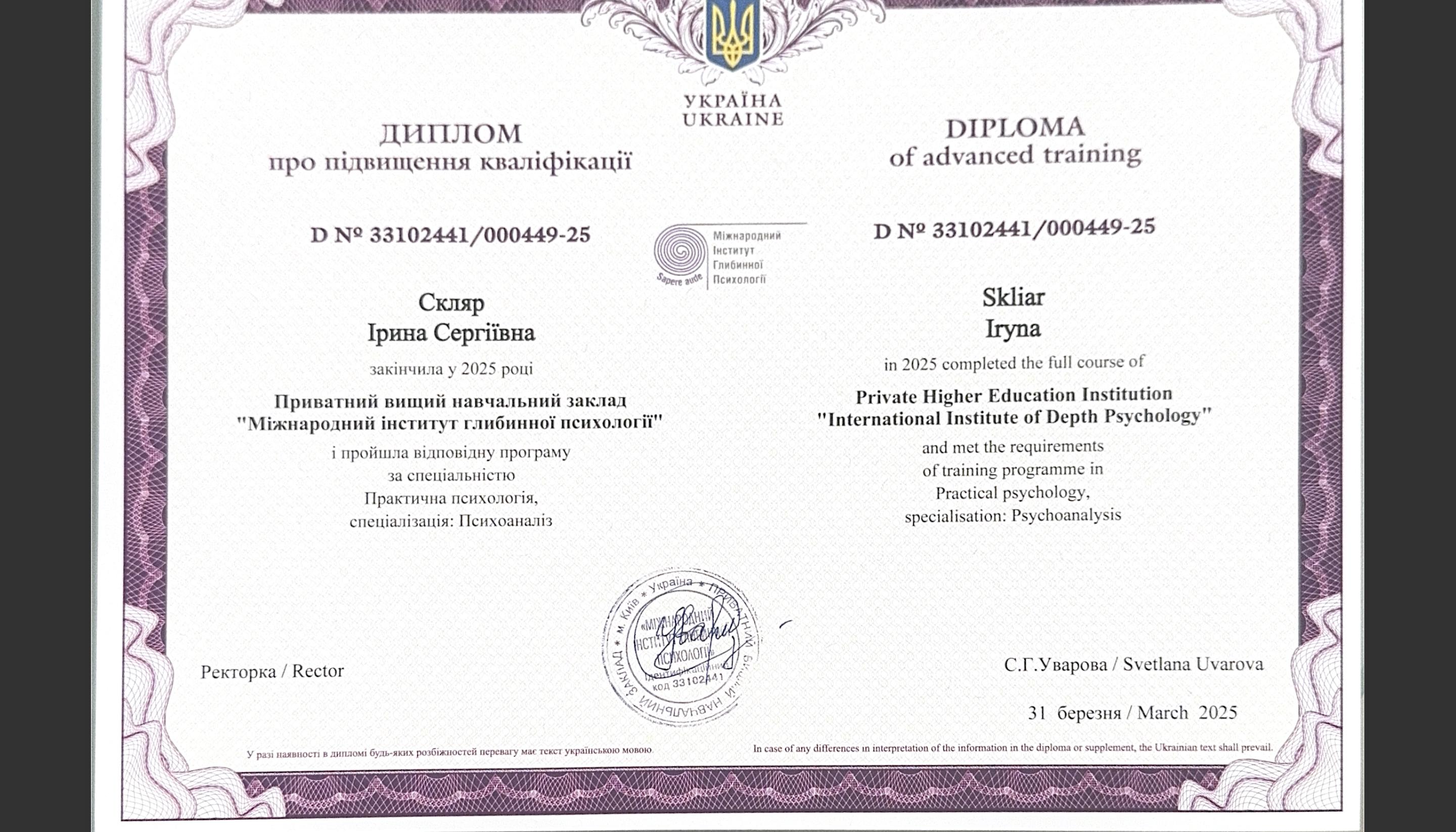 -Приватний ВНЗ «Міжнародній інститут глибинної психології», спеціальність «Практична психологія», спеціалізація «Психоаналіз»