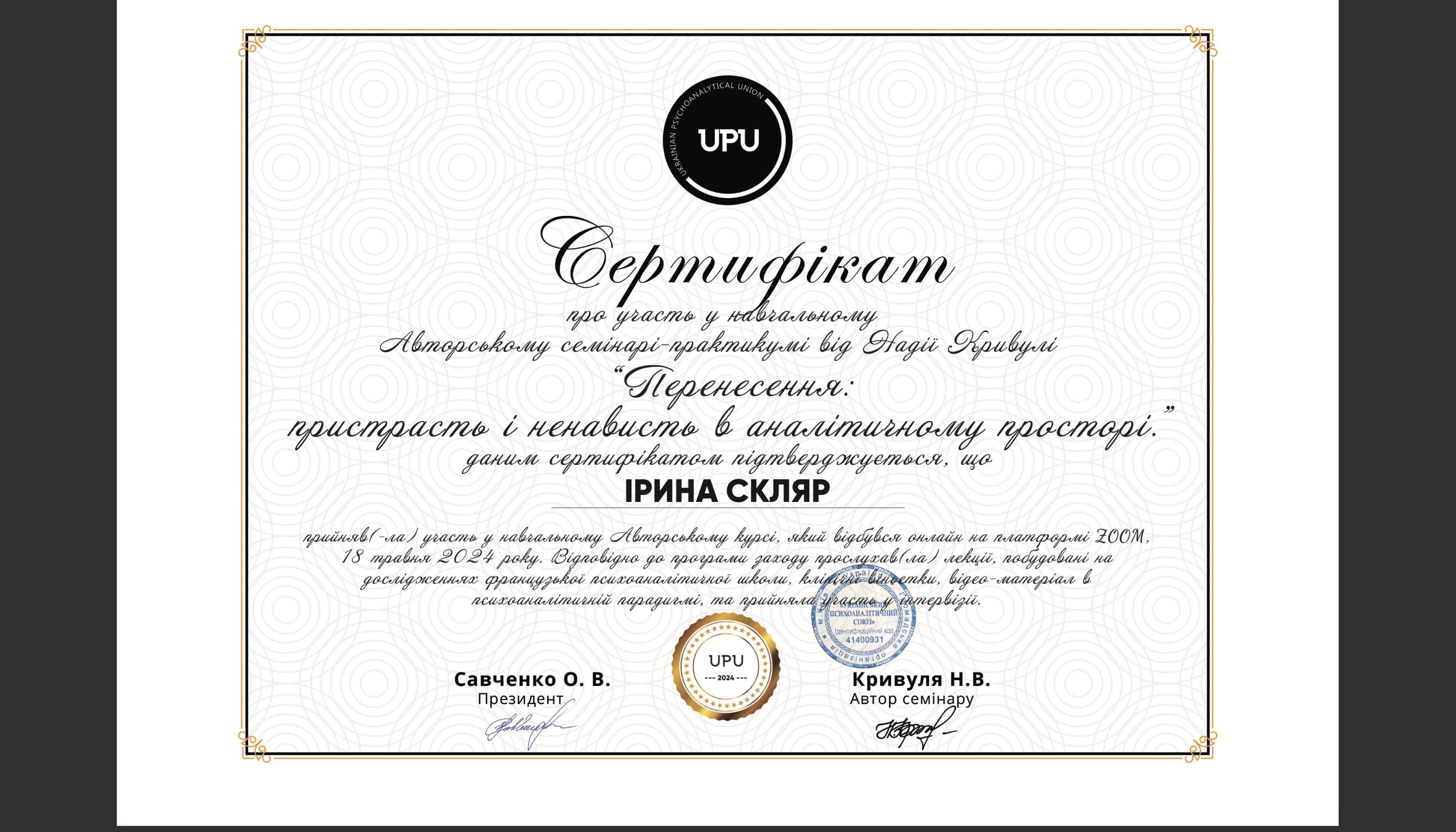 -Центр психоаналізу "Градіва", спеціалізація з клінічного психоаналізу "Психоаналітична робота з не-невротичними пацієнтами", в процесі навчання