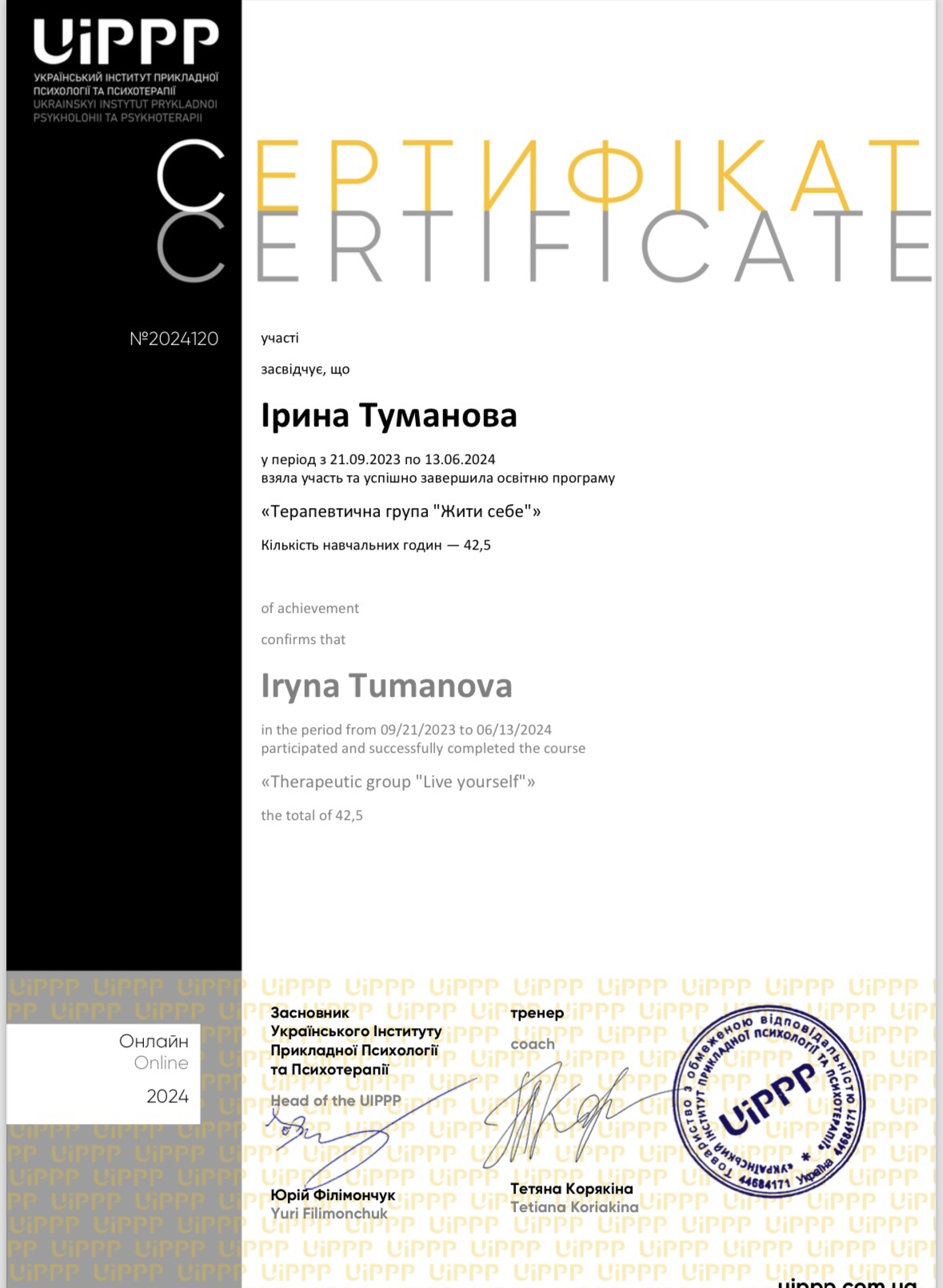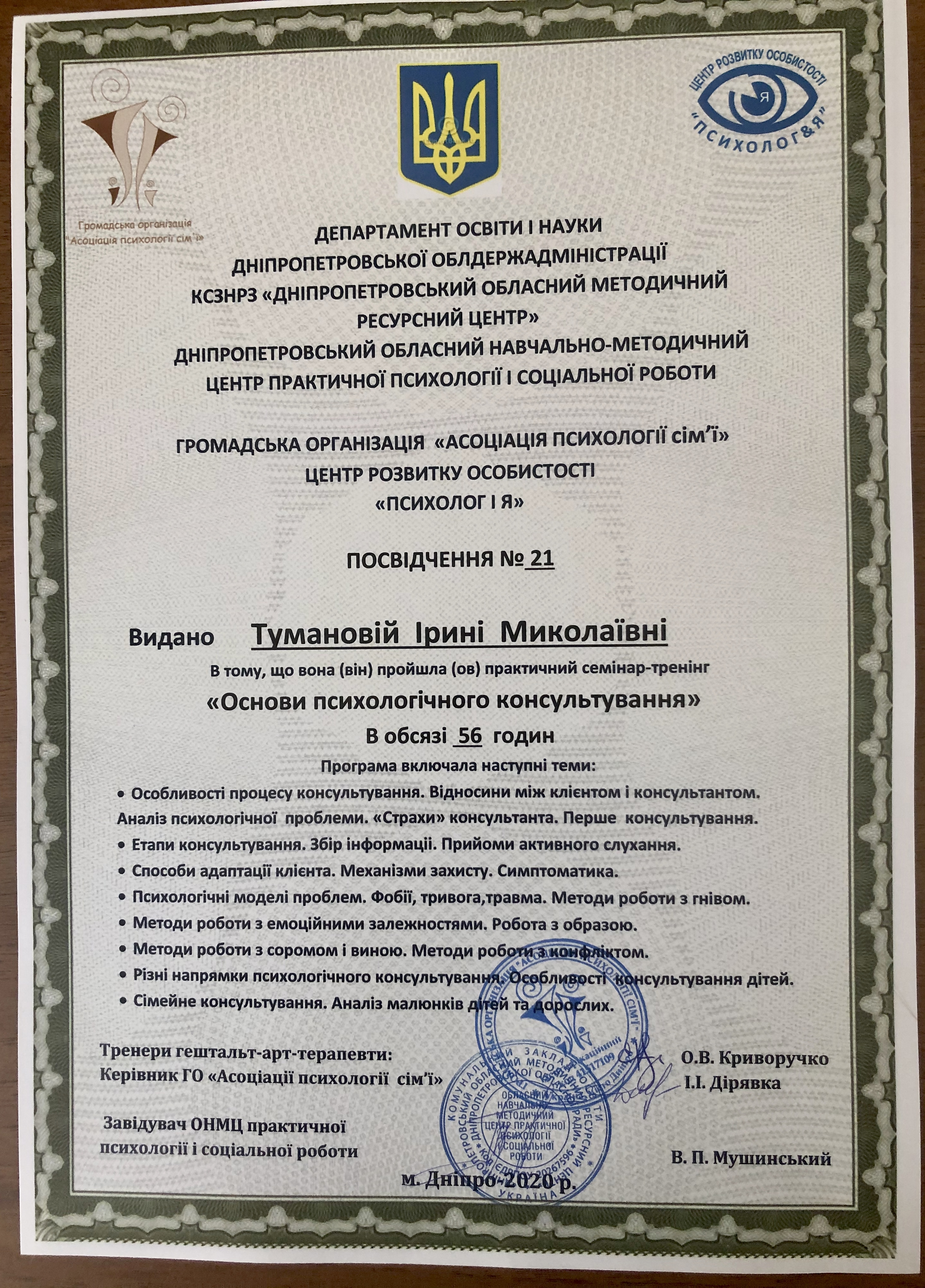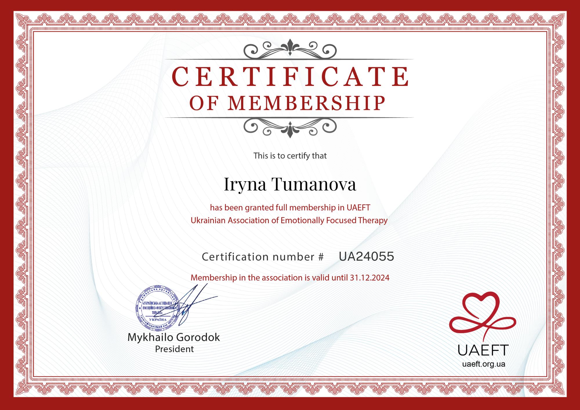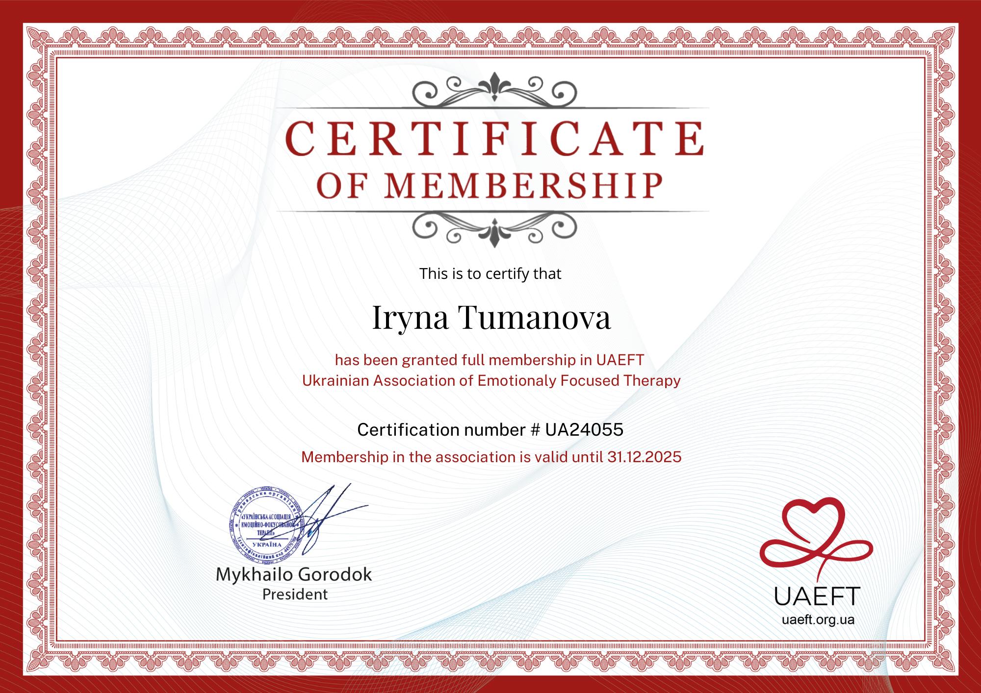 Мене звати Ірина Туманова, я психолог, гештальт-терапевт, емоційно-фокусований терапевт (EFT) та сімейний психолог. Я маю ступінь магістра психології, є членом Національної асоціації психологів України (EFPA), Української асоціації EFT-терапевтів (UAEFT) та Міжнародної асоціації EFT (ICEEFT).