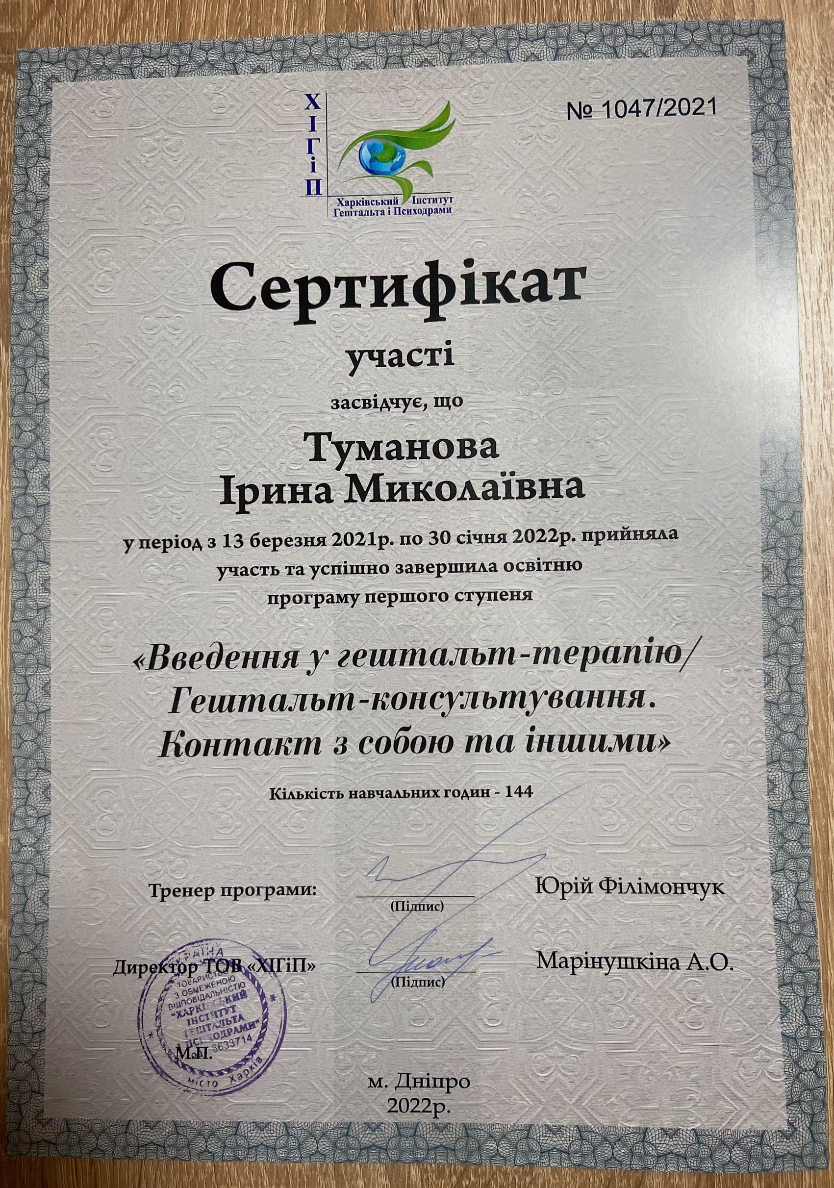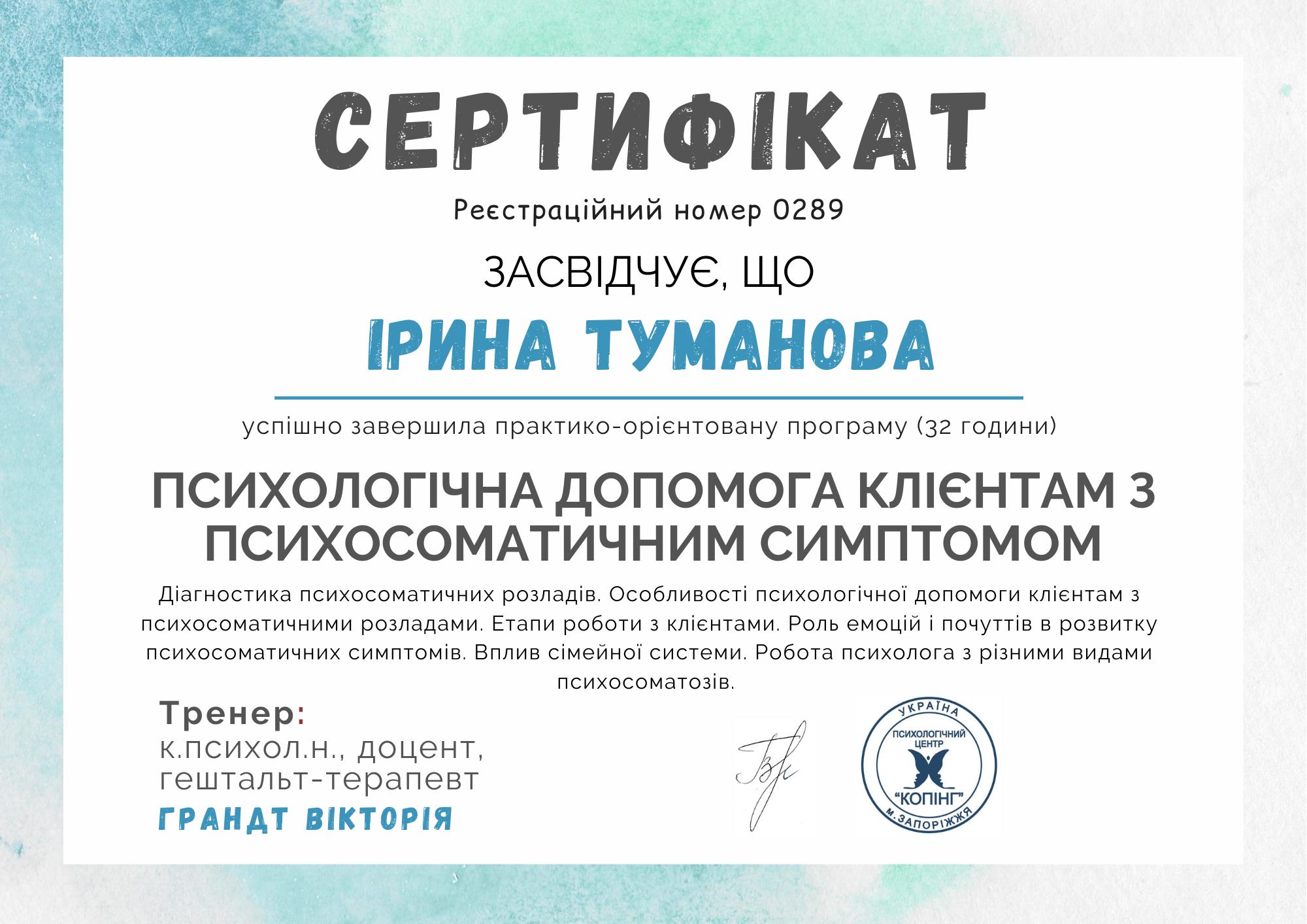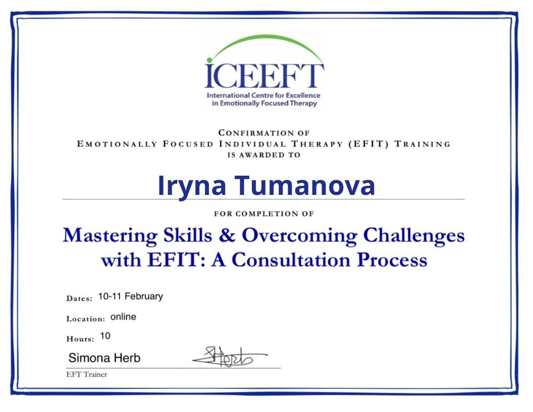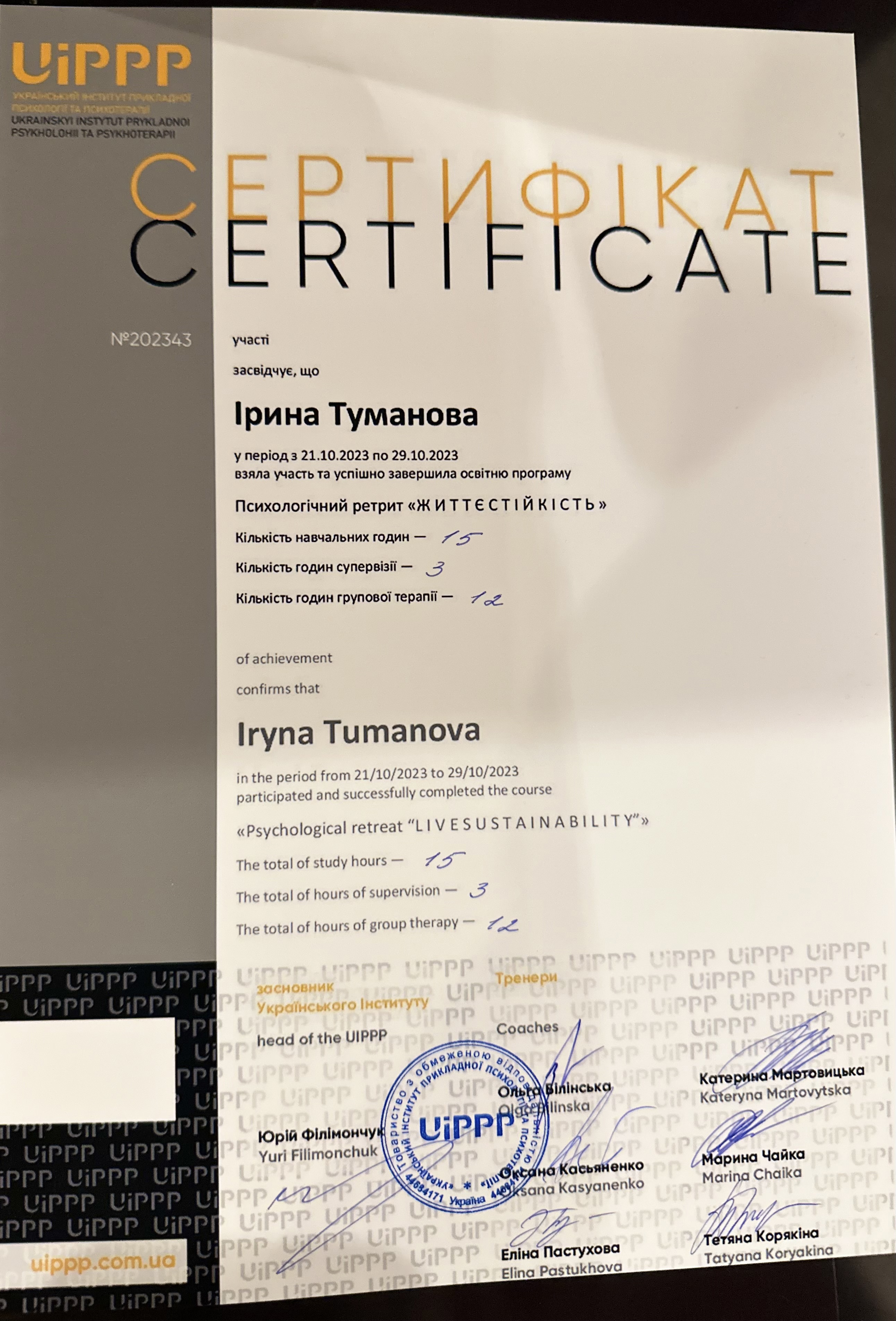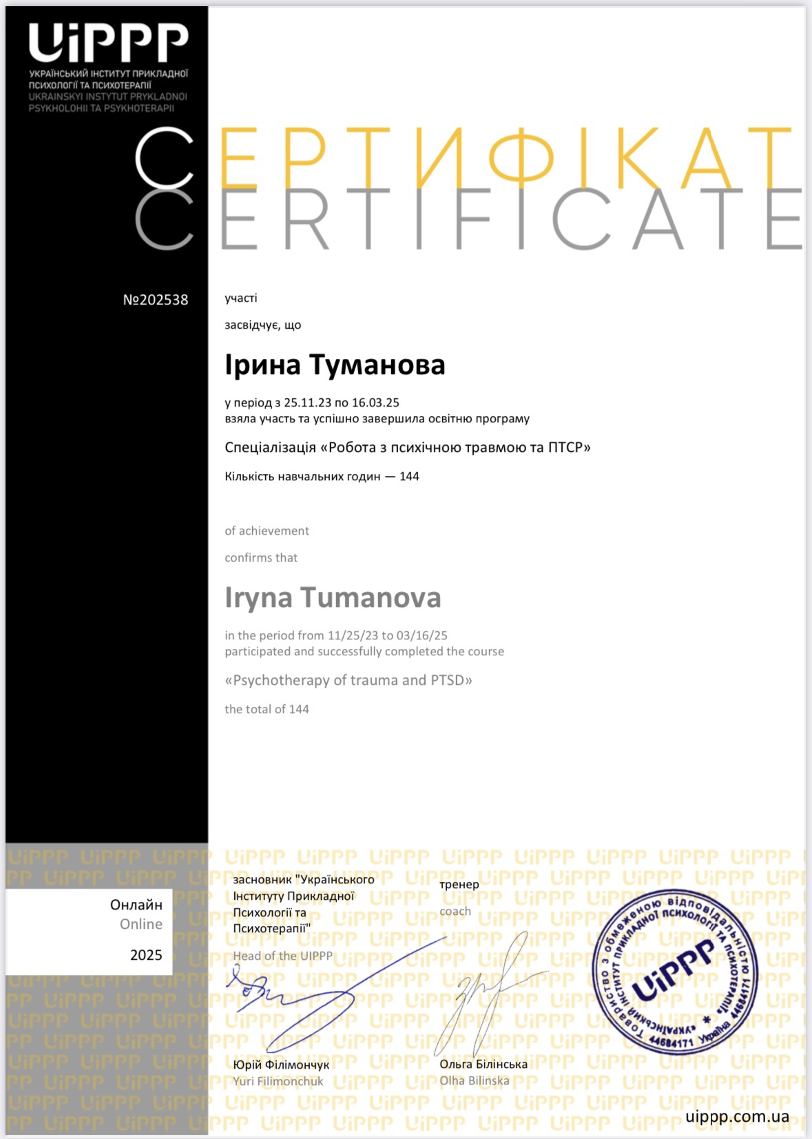 Мене звати Ірина Туманова, я психолог, гештальт-терапевт, емоційно-фокусований терапевт (EFT) та сімейний психолог. Я маю ступінь магістра психології, є членом Національної асоціації психологів України (EFPA), Української асоціації EFT-терапевтів (UAEFT) та Міжнародної асоціації EFT (ICEEFT).