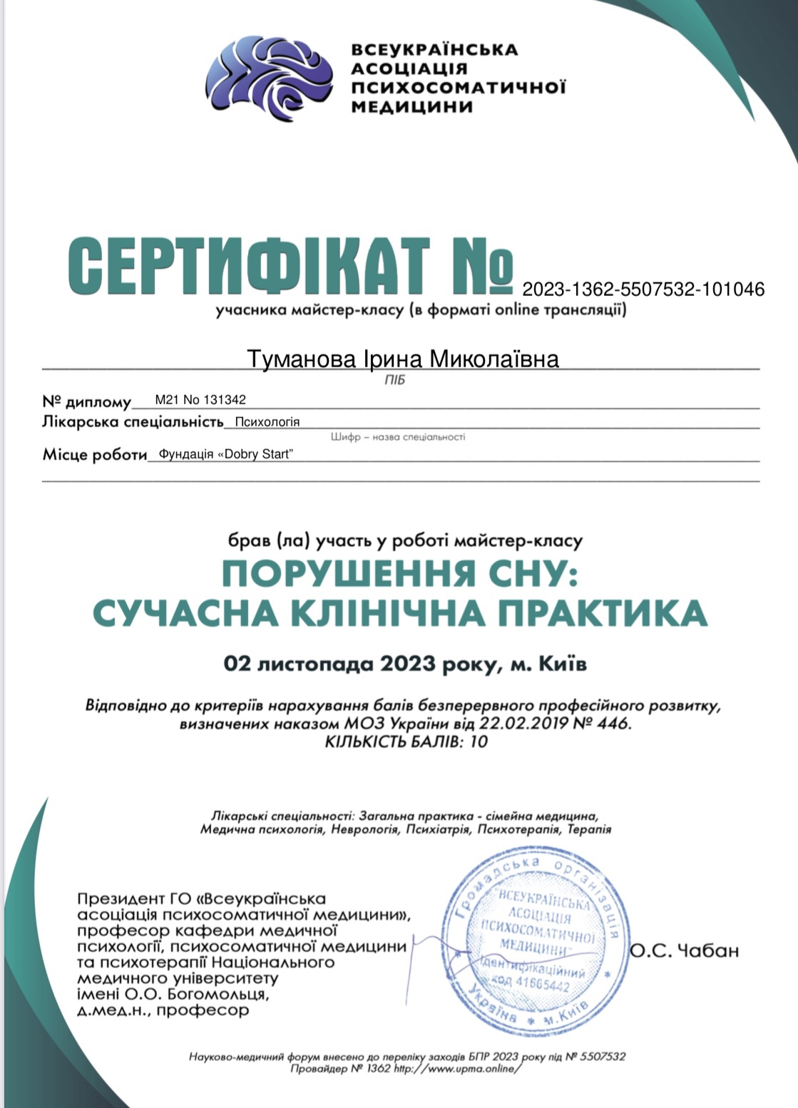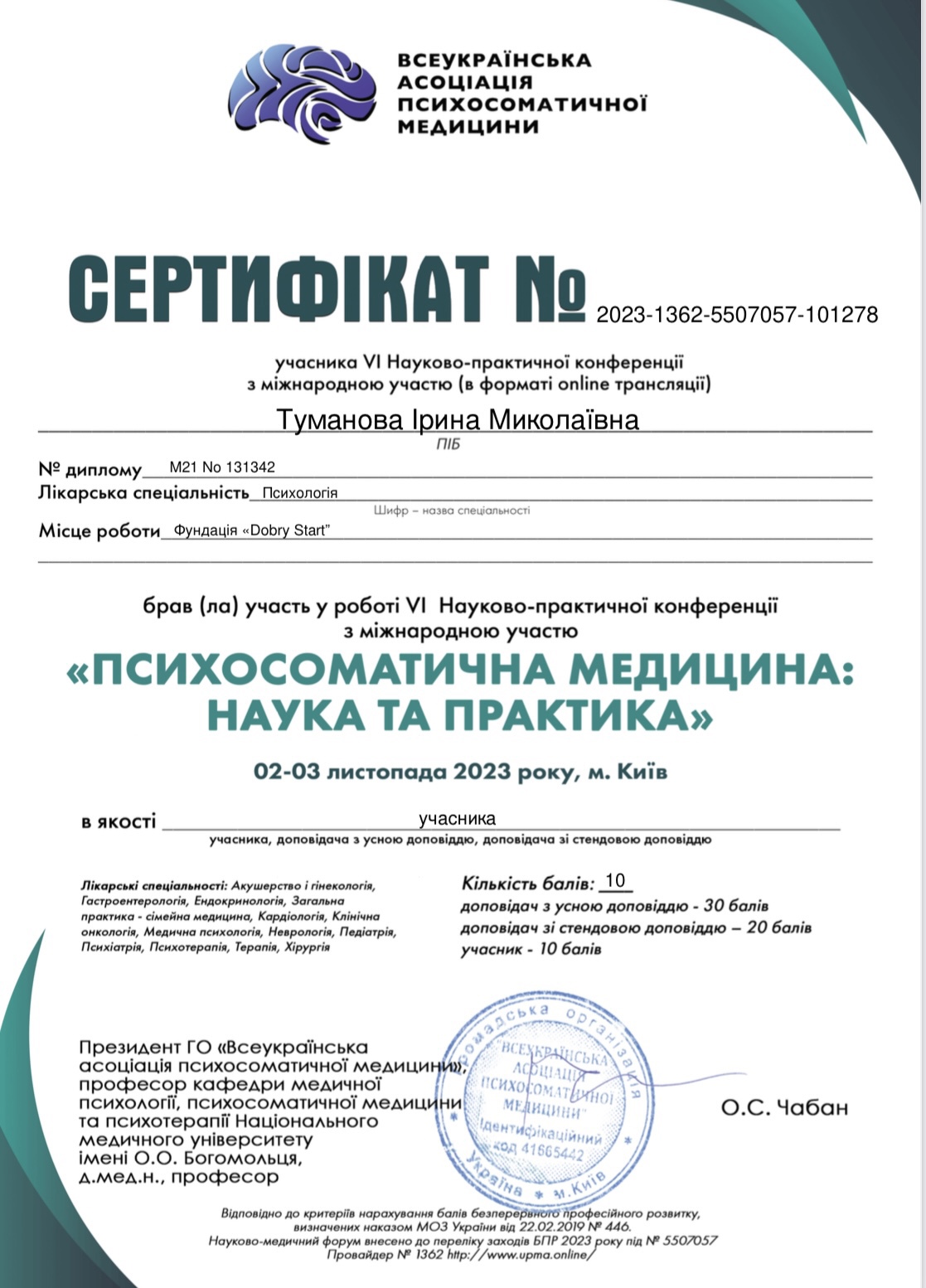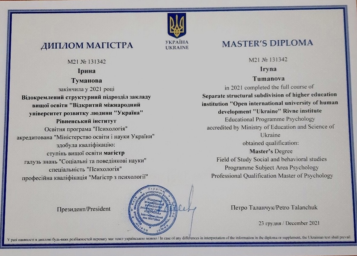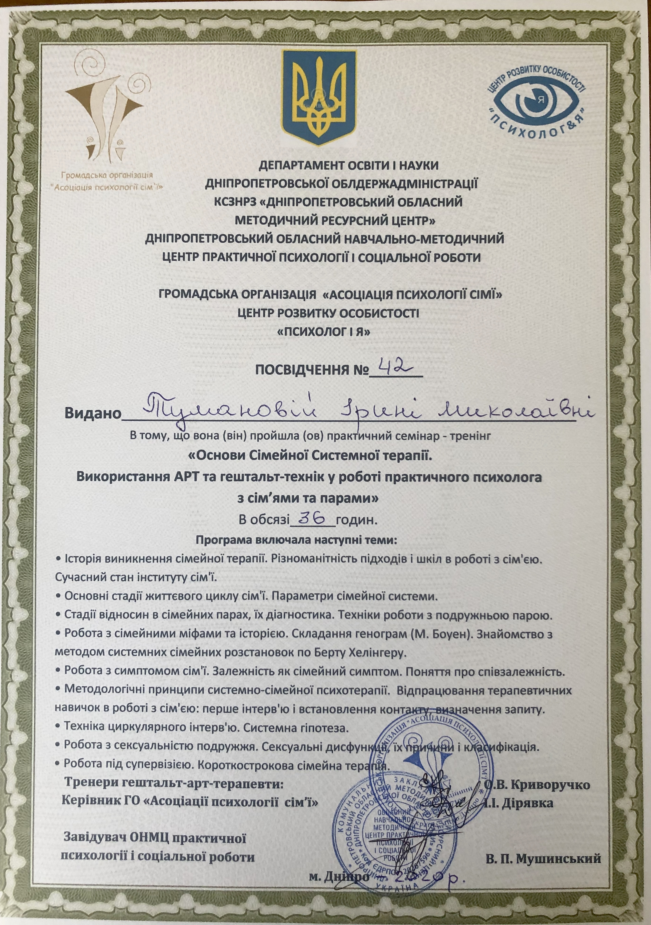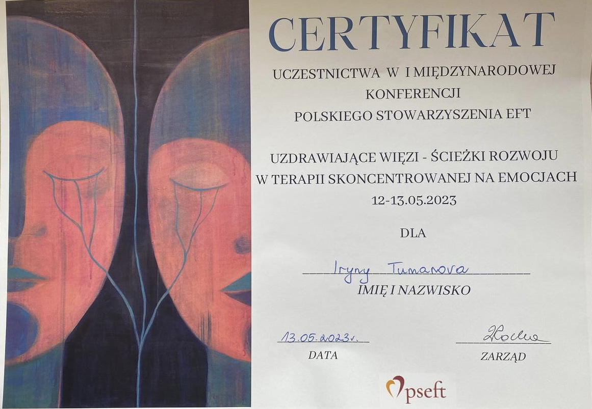 Мене звати Ірина Туманова, я психолог, гештальт-терапевт, емоційно-фокусований терапевт (EFT) та сімейний психолог. Я маю ступінь магістра психології, є членом Національної асоціації психологів України (EFPA), Української асоціації EFT-терапевтів (UAEFT) та Міжнародної асоціації EFT (ICEEFT).