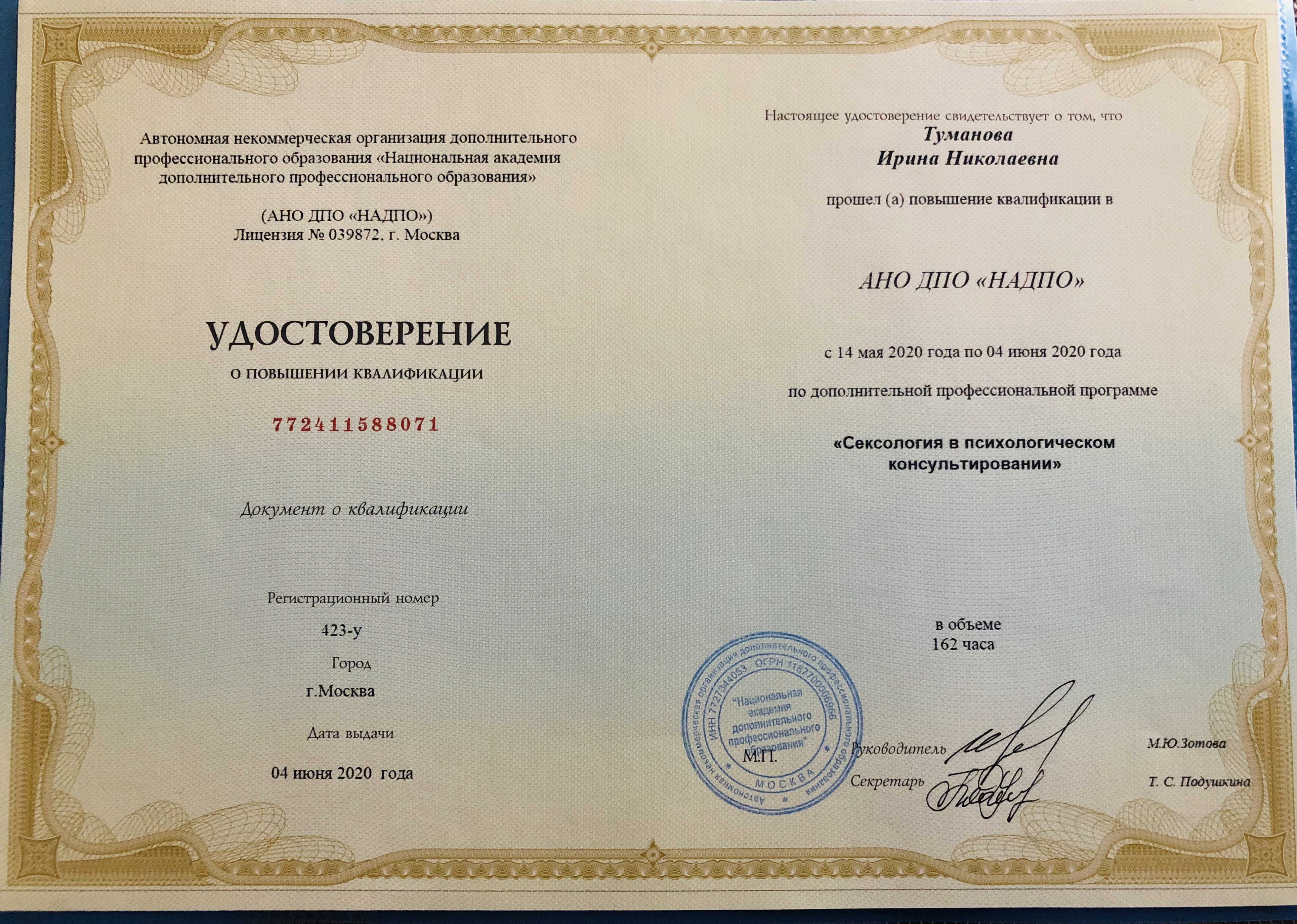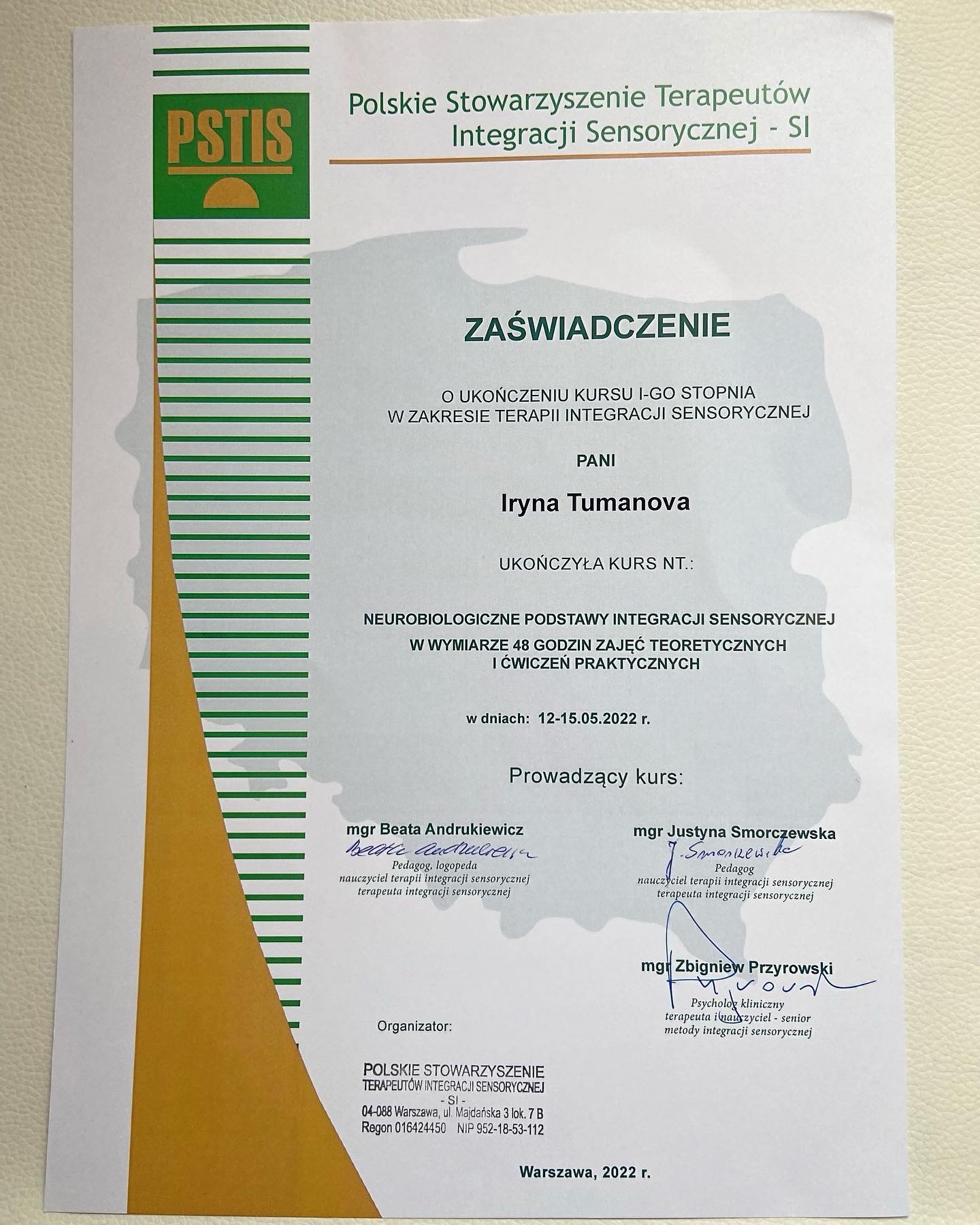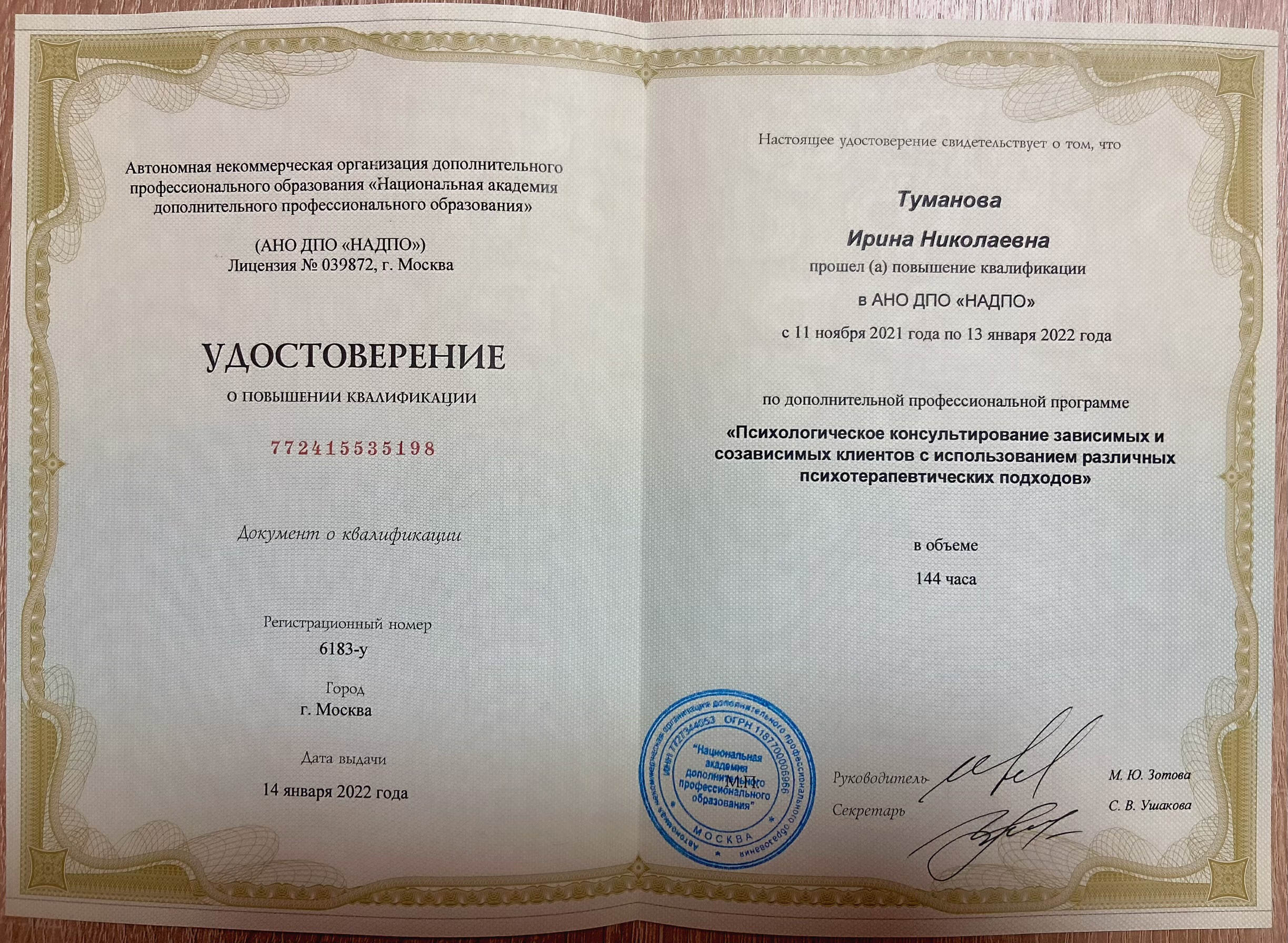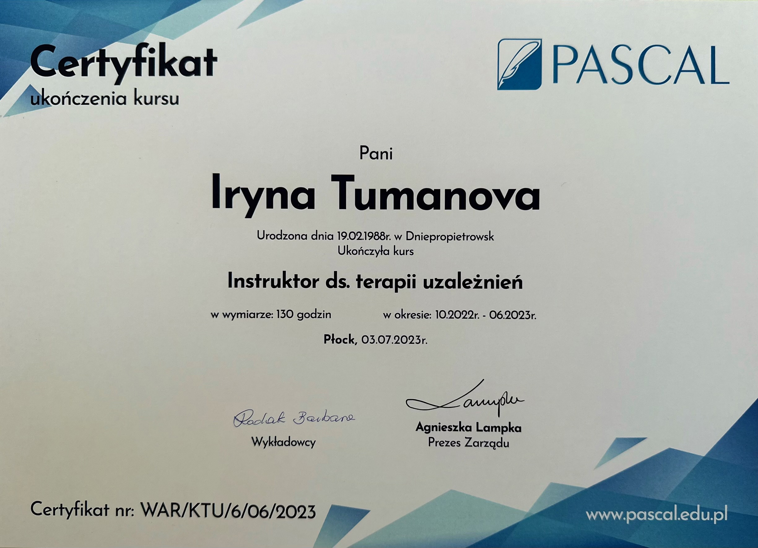 Мене звати Ірина Туманова, я психолог, гештальт-терапевт, емоційно-фокусований терапевт (EFT) та сімейний психолог. Я маю ступінь магістра психології, є членом Національної асоціації психологів України (EFPA), Української асоціації EFT-терапевтів (UAEFT) та Міжнародної асоціації EFT (ICEEFT).