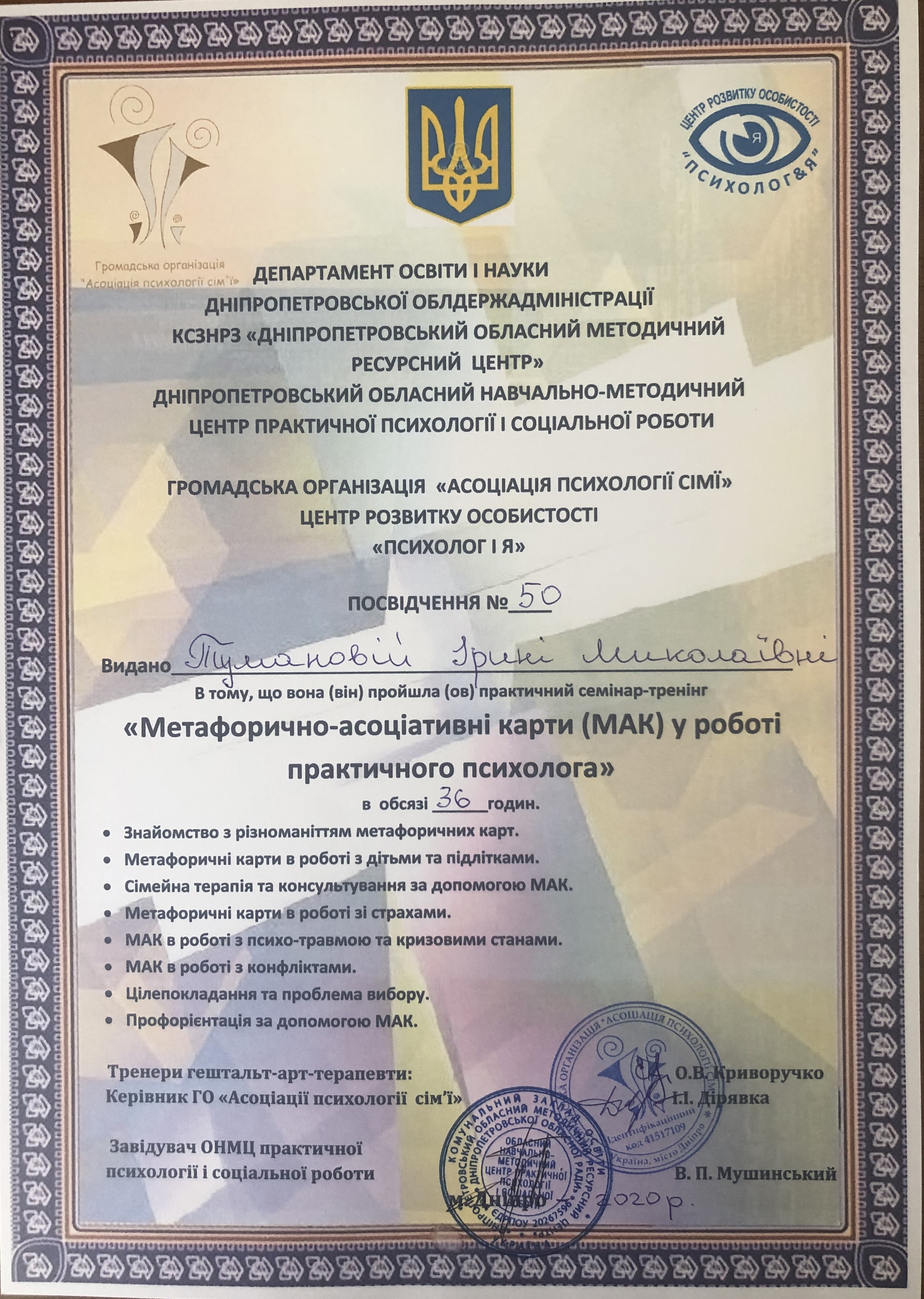Також я працюю з психосоматичними запитами – коли емоційні переживання проявляються через фізичні симптоми: головний біль, хронічну втому, проблеми з травленням, безсоння, напругу в тілі тощо. Допомагаю клієнтам знаходити зв’язок між тілом і психікою, усвідомлювати приховані емоції та проживати їх без шкоди для здоров’я.