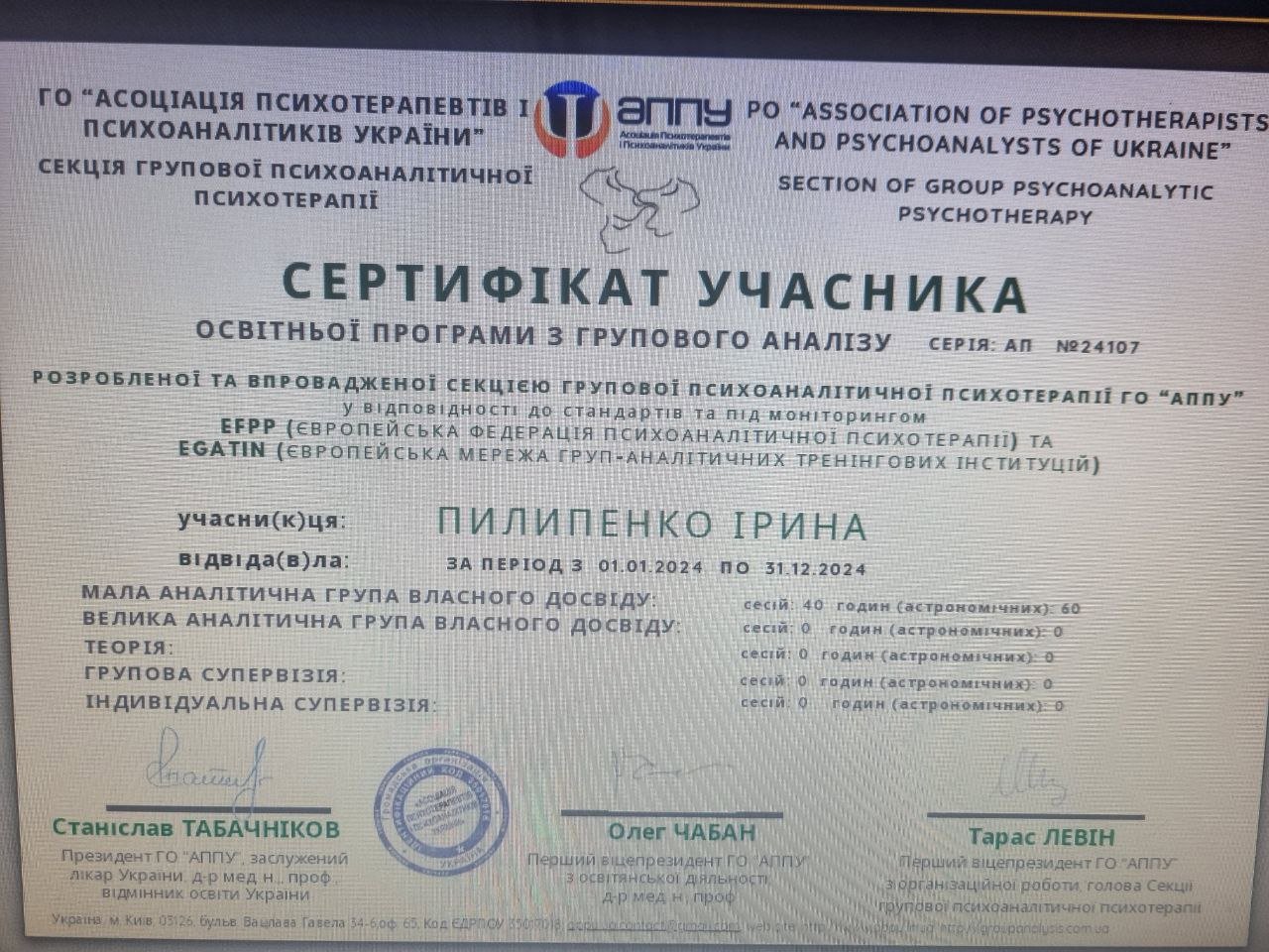 З 2018 рокупроходжу навчання у секції групового аналізу, являюсь членом АППУ.