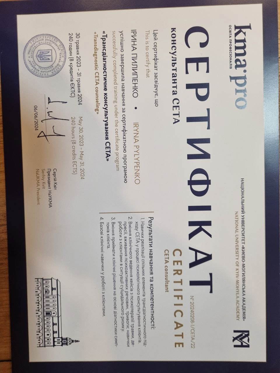 Я — психолог, для якого важливі безпека, повага та прийняття. У роботі я уважна й підтримувальна, працюю без осуду та тиску, з повагою до темпу клієнта.