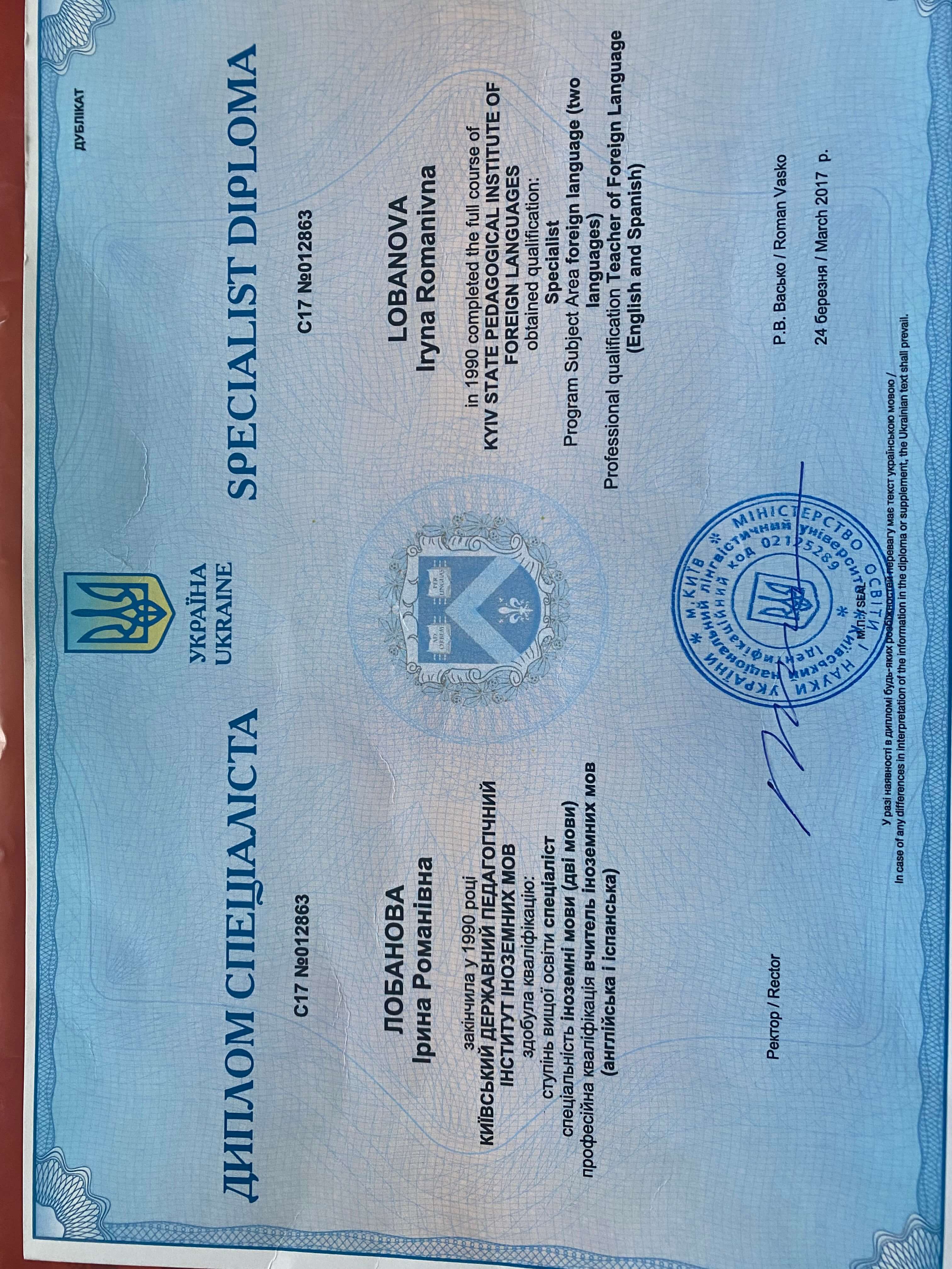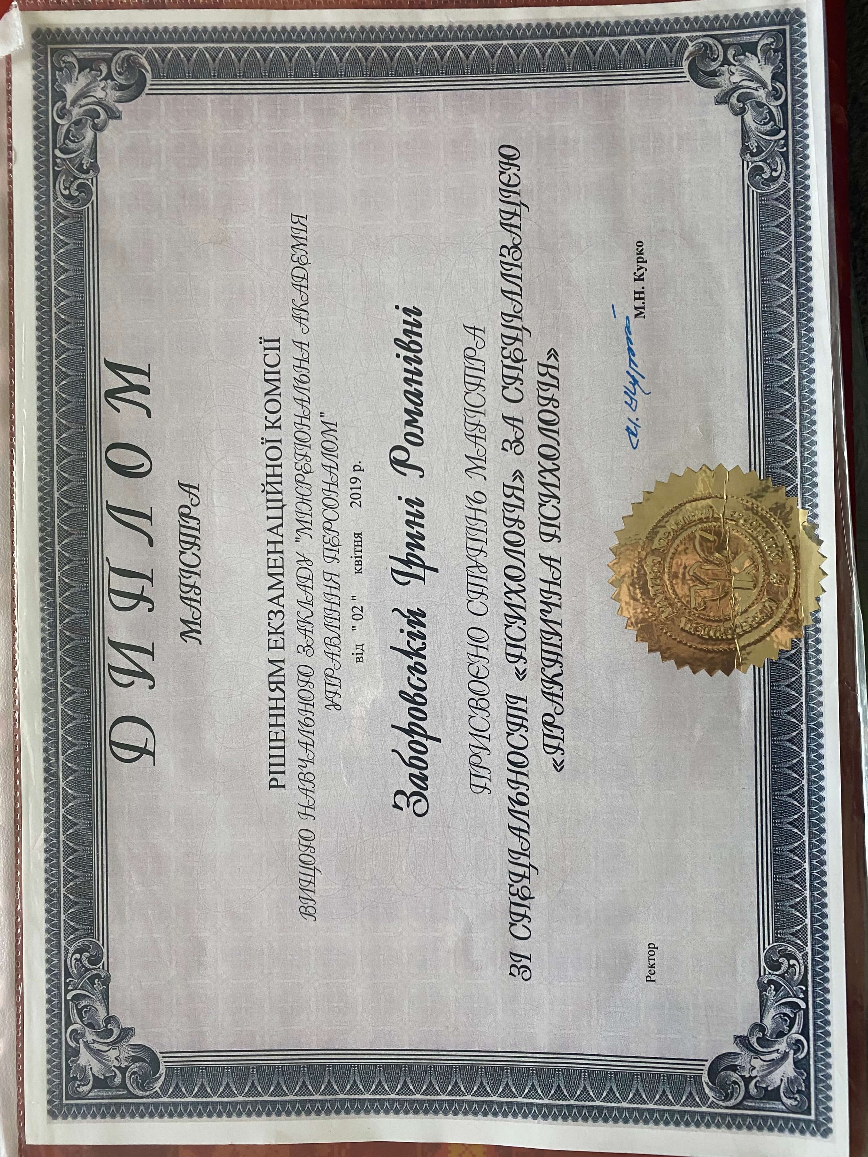 МАУП, практичний психолог (2 вища освіта); закінчую 2 ступінь у ВОППГП (Український Гештальт Ігститут