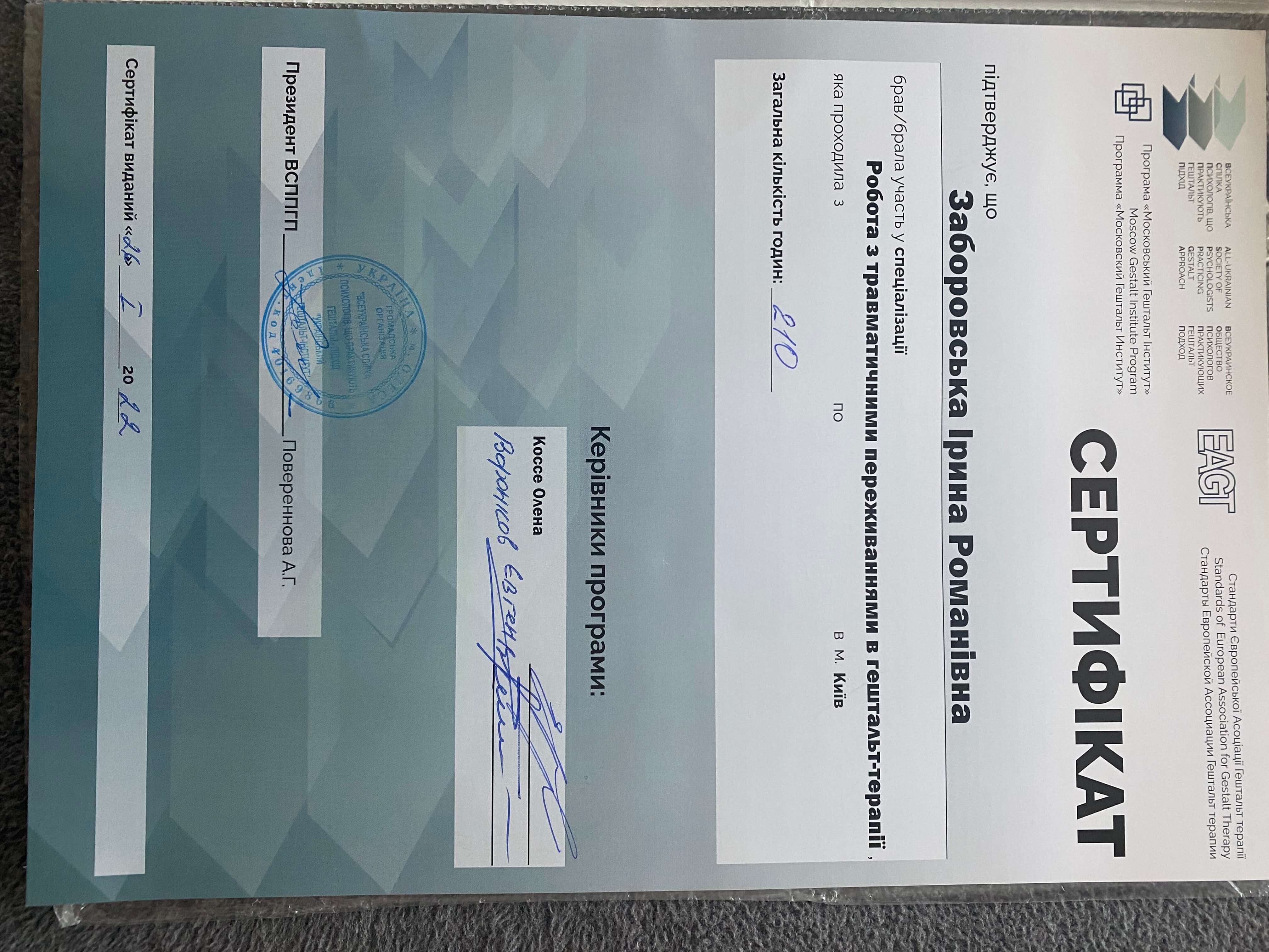 Спеціалізація по темі «Робота с травматичними та кризовими ситуаціями в Гештальті», участь у конференціях «Mental Health”, « Соціальні виклики и особисті кризи в житті Гештальт терапевта», «Новий час:зміна та вʼязок поколінь».