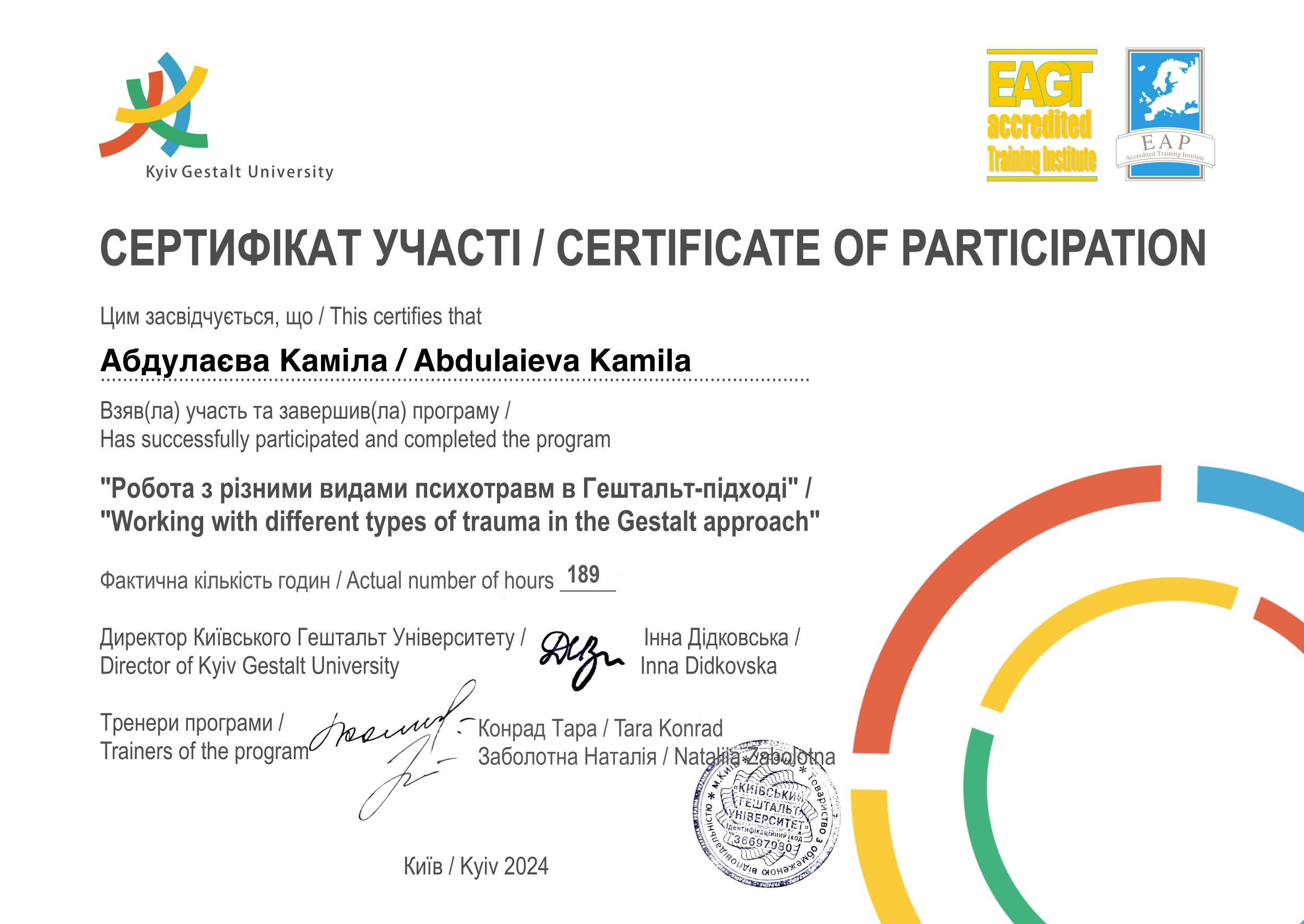 Спеціалізація по роботі з різними видами психотравм 189 годин