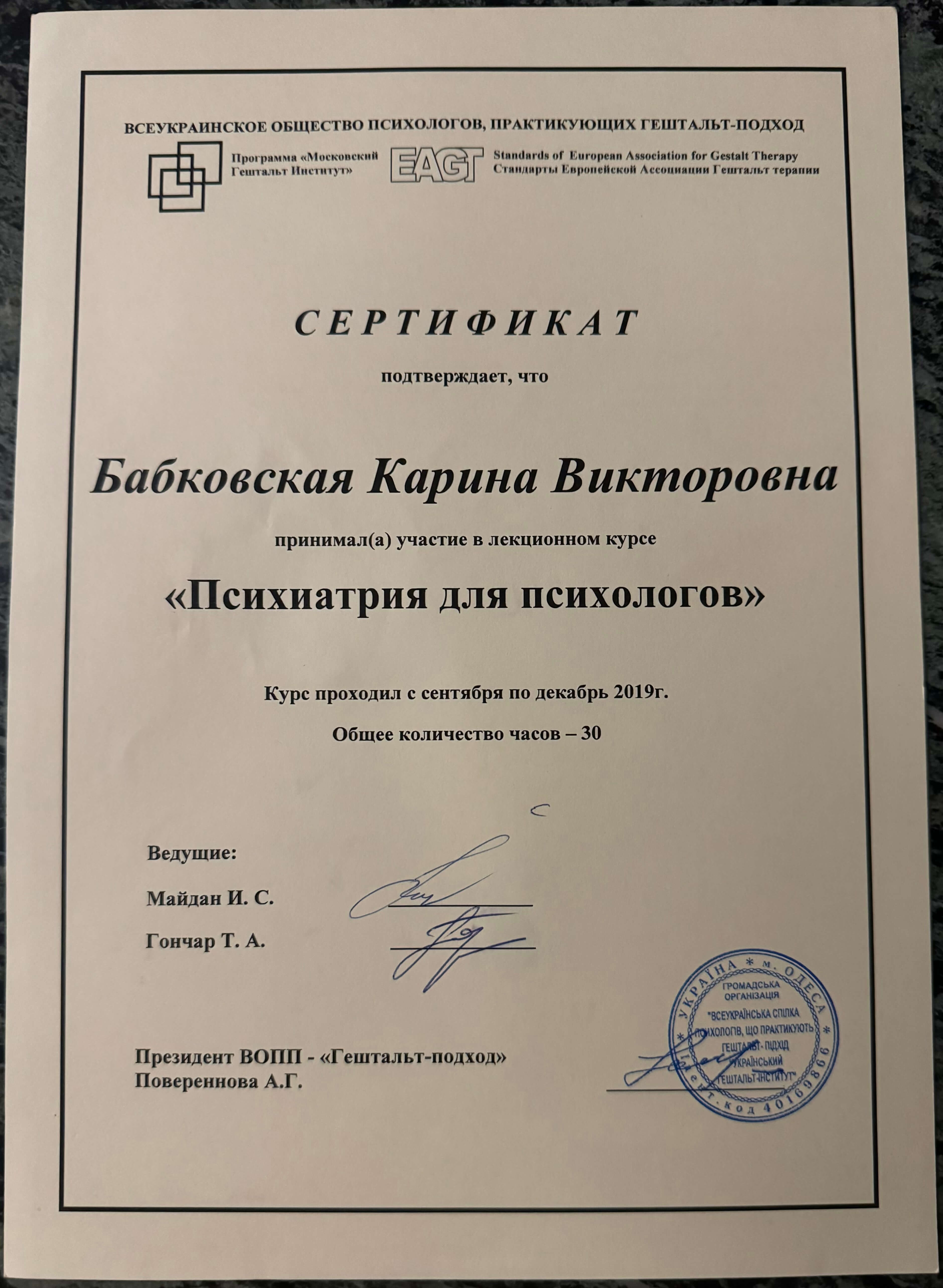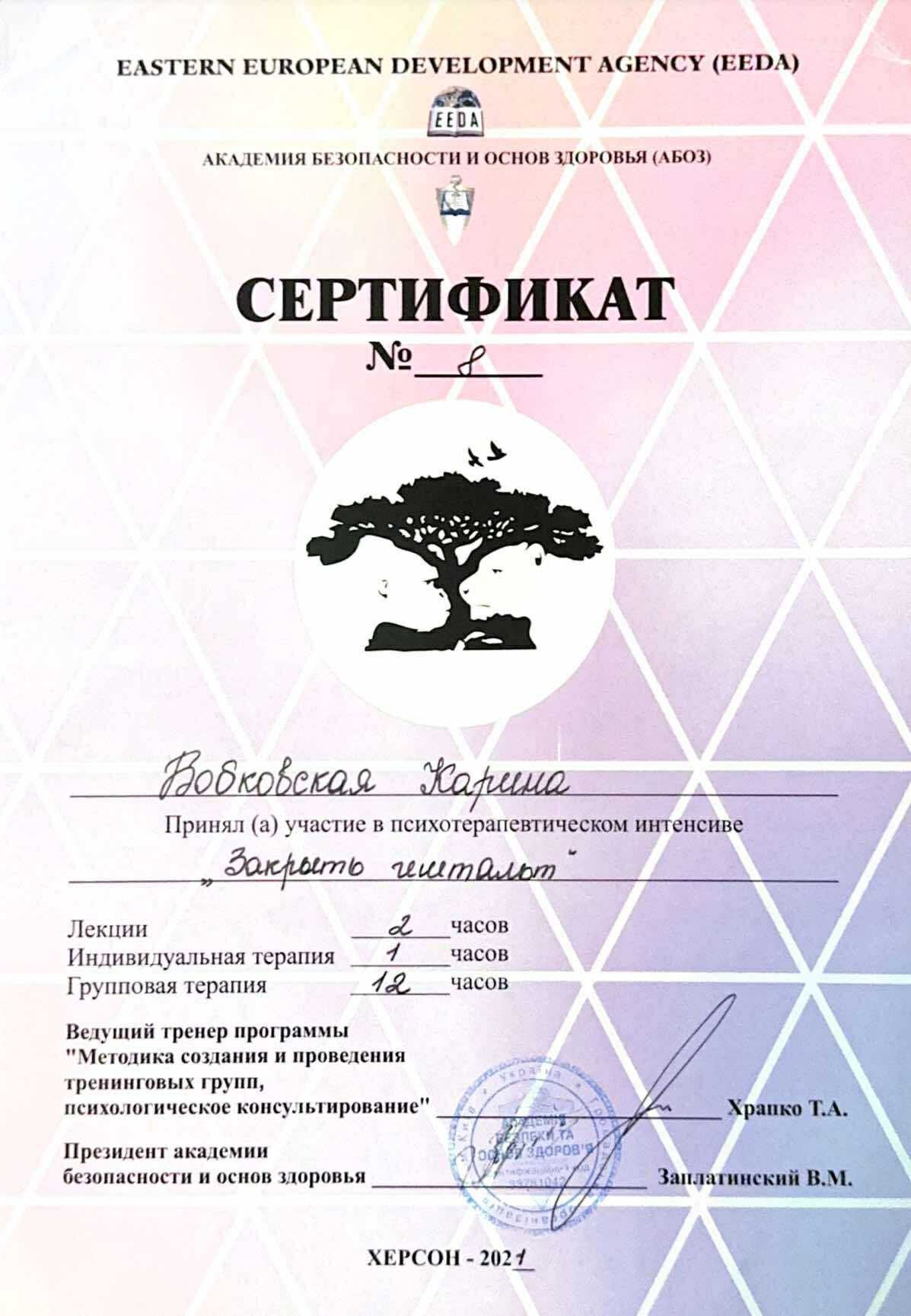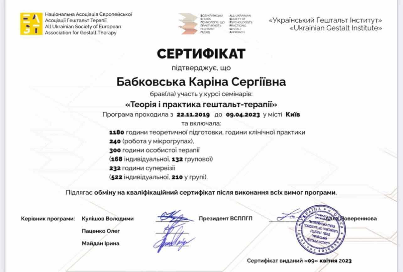 Сериифікований гештальт терапевт НАХТУ, маю три спеціалізації в гештальт підході: клінічна, робота з травмою, сексологія.