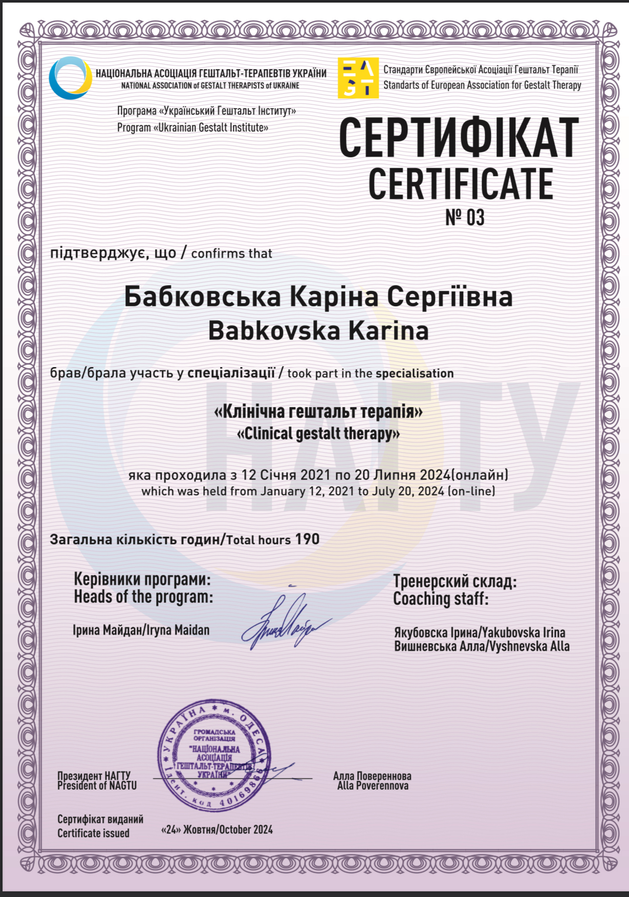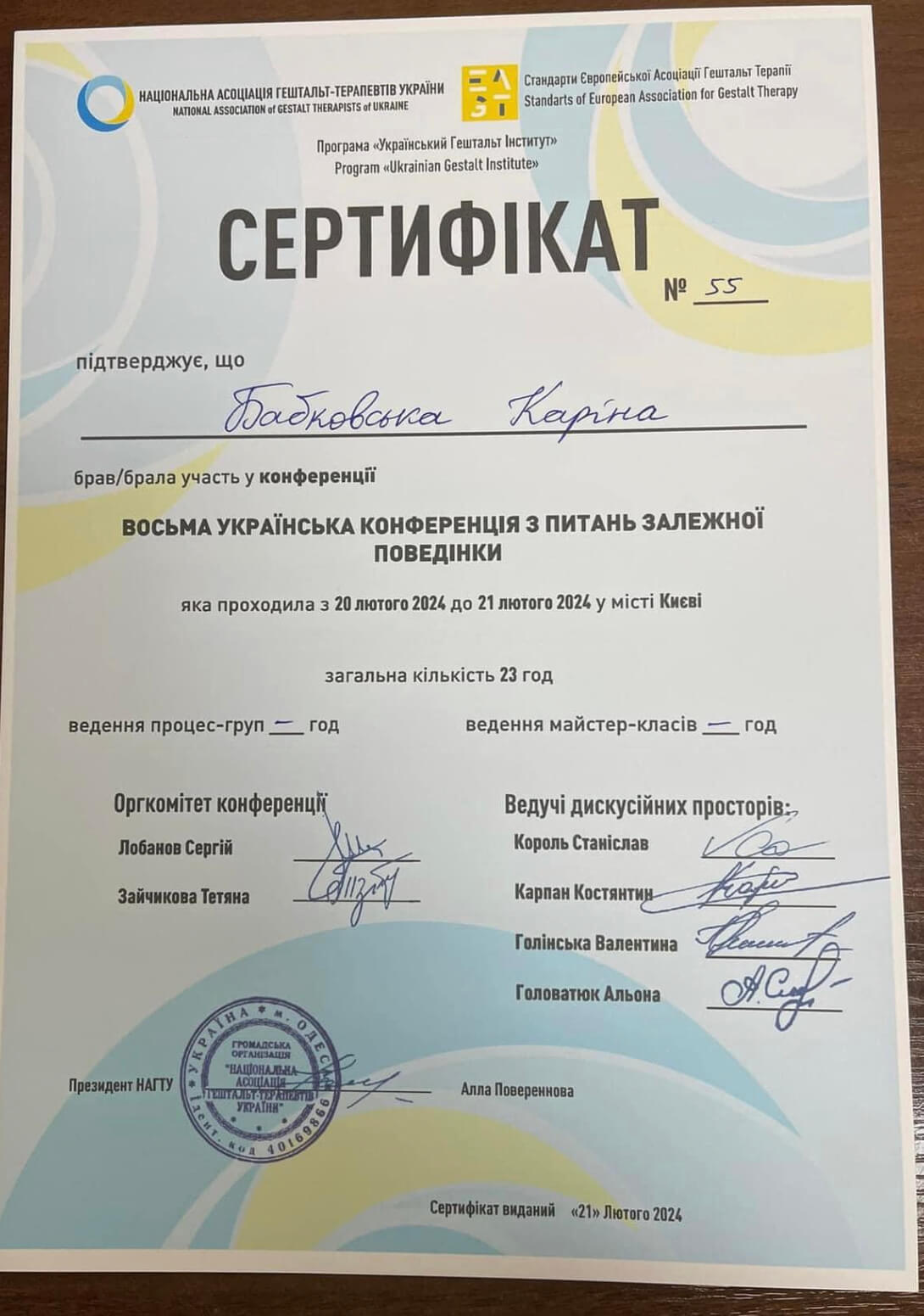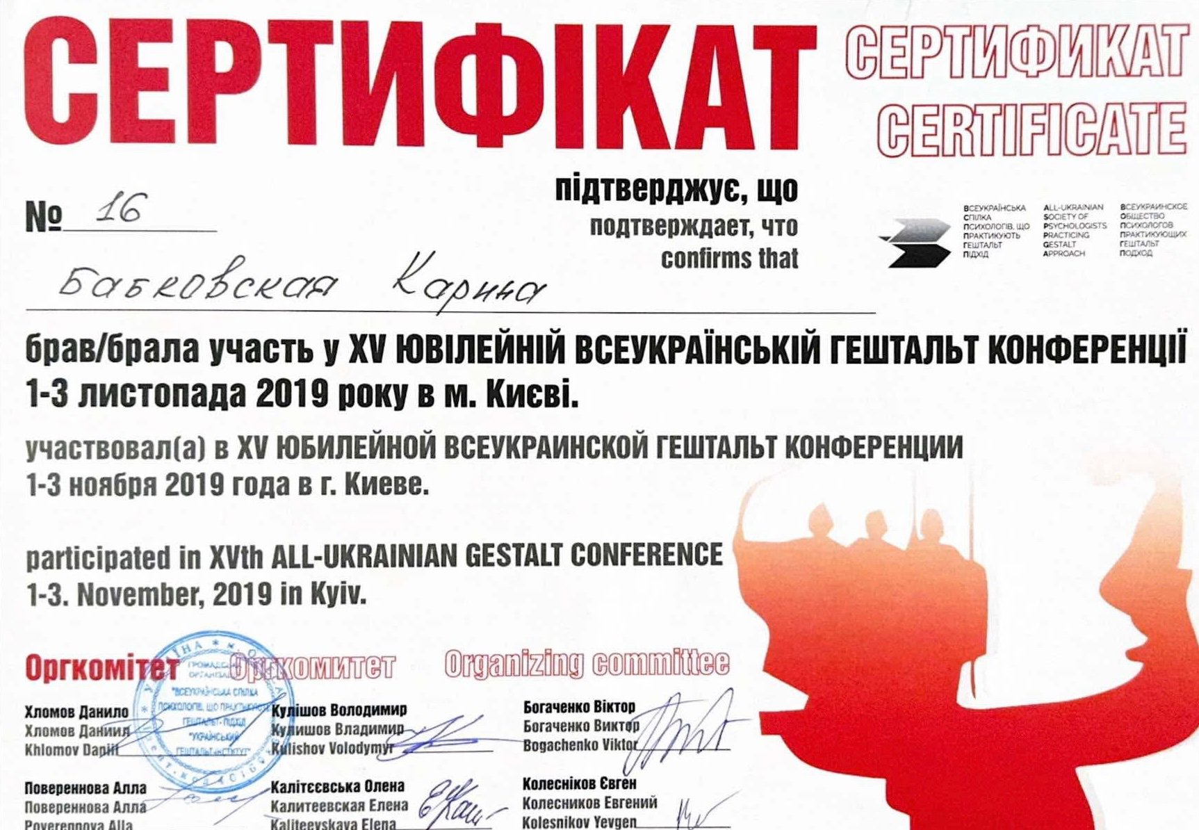 Сериифікований гештальт терапевт НАХТУ, маю три спеціалізації в гештальт підході: клінічна, робота з травмою, сексологія.