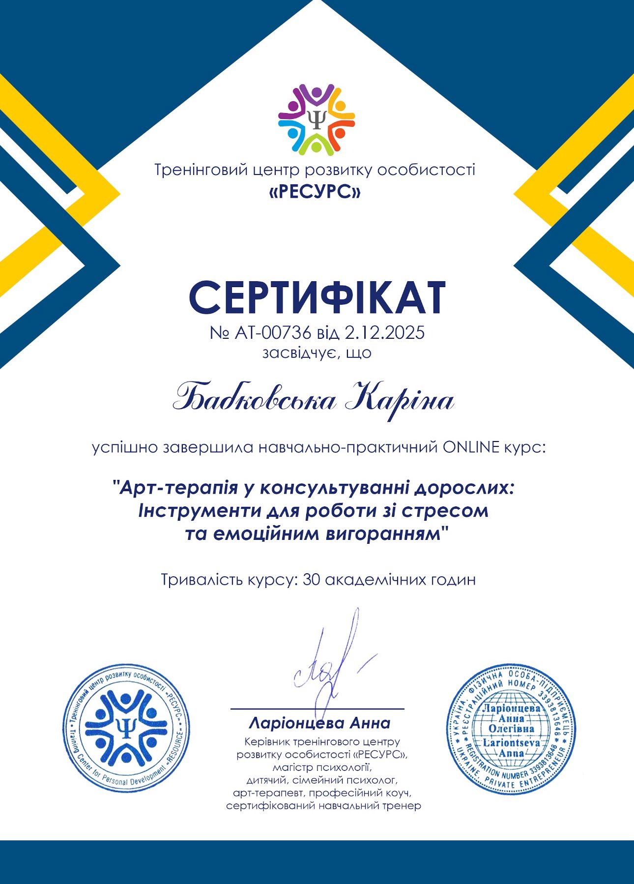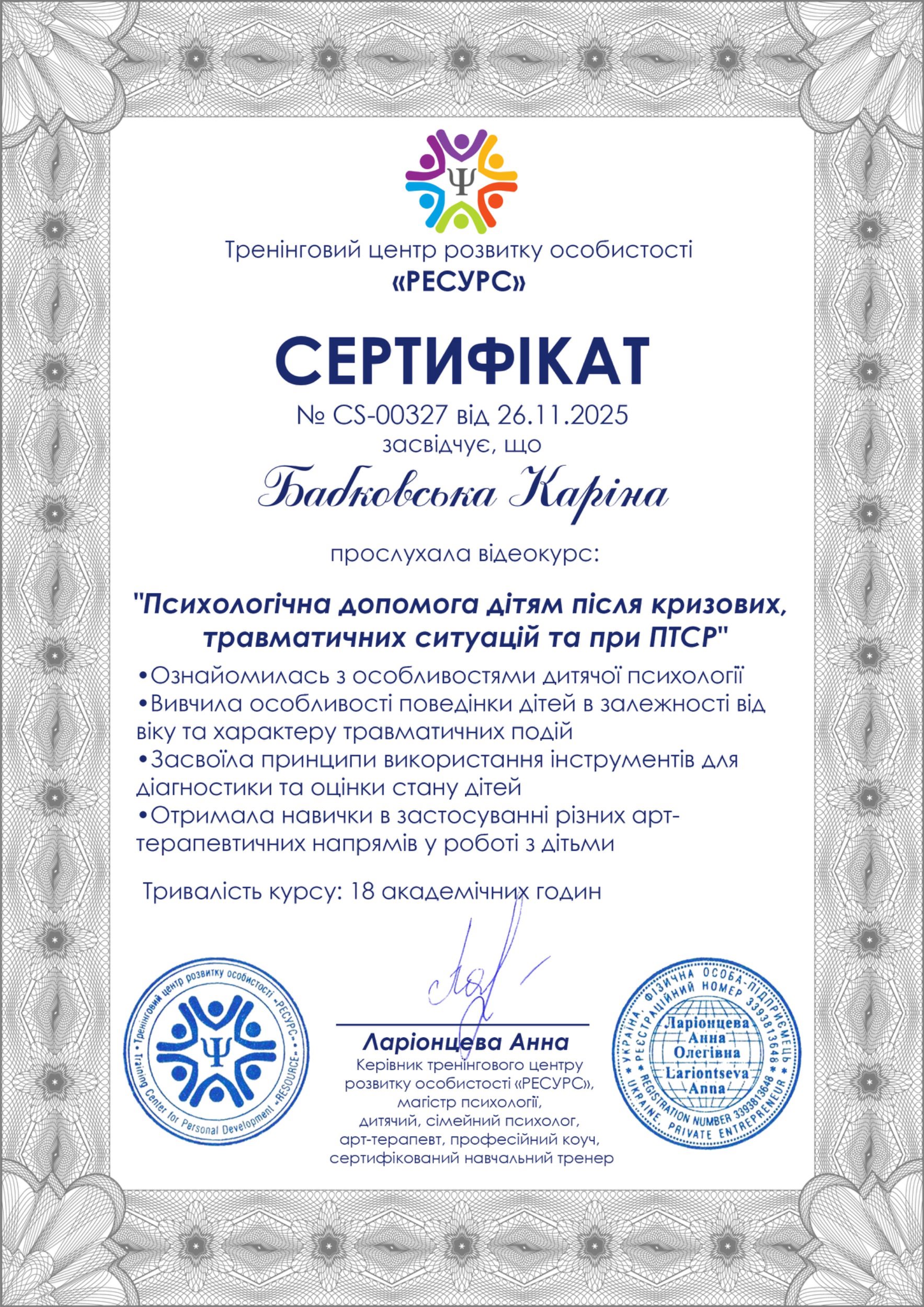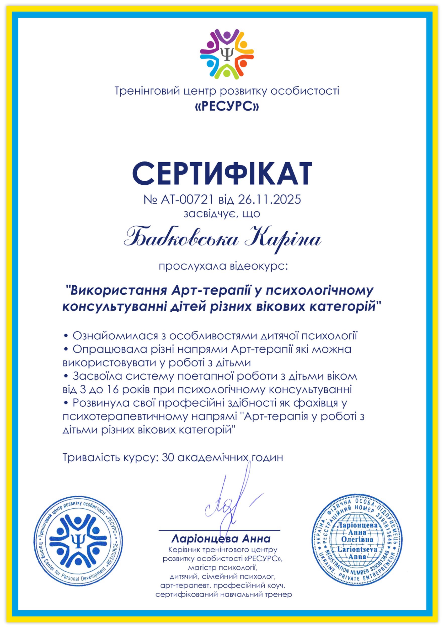 Маю диплом психолога, закінчила другу ступінь підготовки гештальт-терапевтів в НАГТУ (сертифікований гештальт терапевт) та спеціалізації по психологічній травмі в гештальт підході, сексології та клінічній психології. Пройшла спеціалізації з дитячої та дорослої арт-терапії, а також з кризової та травмоорієнтованої допомоги.