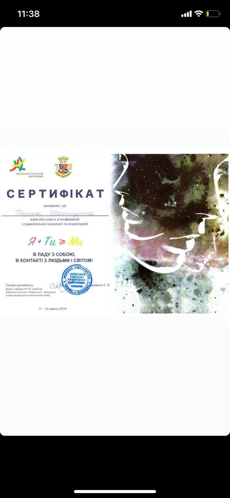 3. Сертифікат про закінчення І ступеня Київського Гештальт Університету (зараз завершую навчання на ІІ ступені);