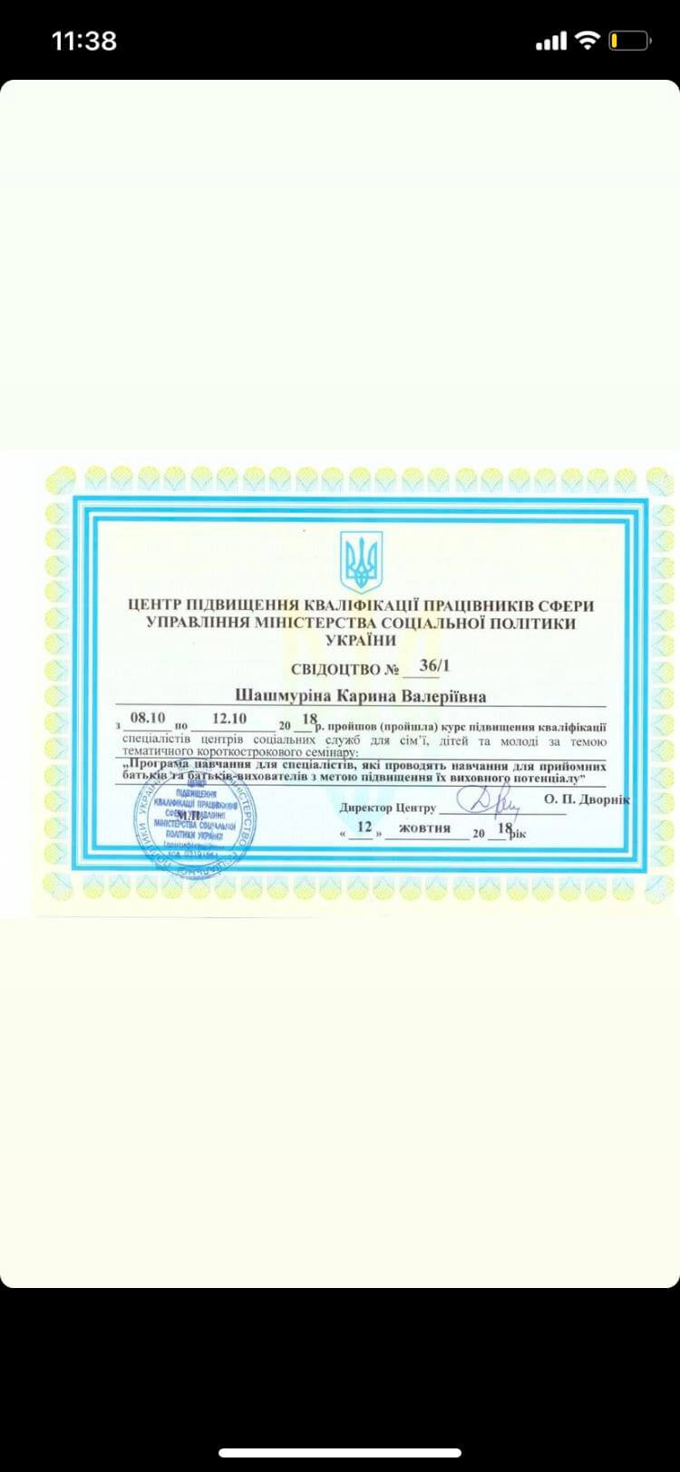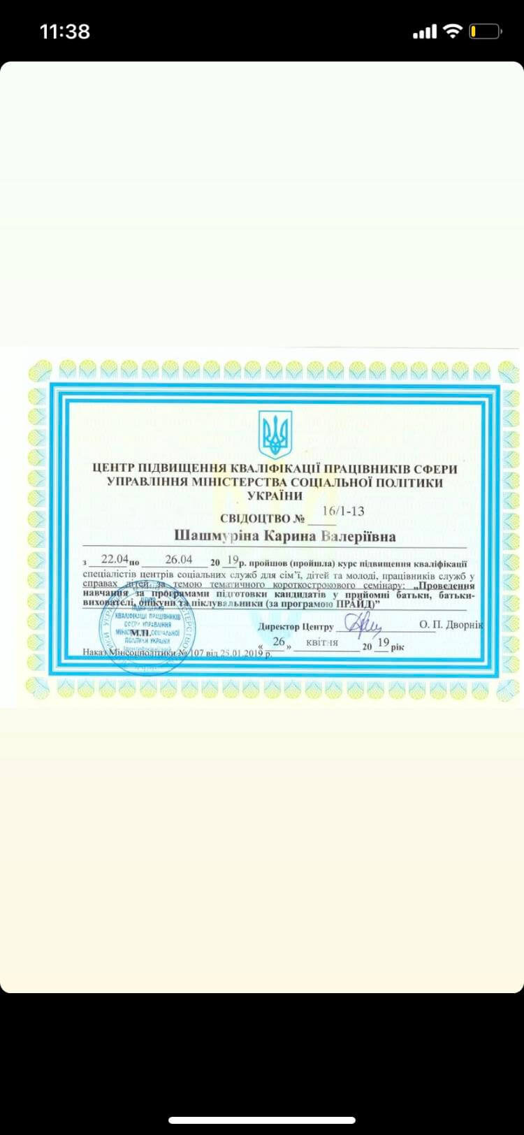 5. Свідоцтво Міністерства соціальної політики, що дає право проводити групи з підвищення батьківського потенціалу.