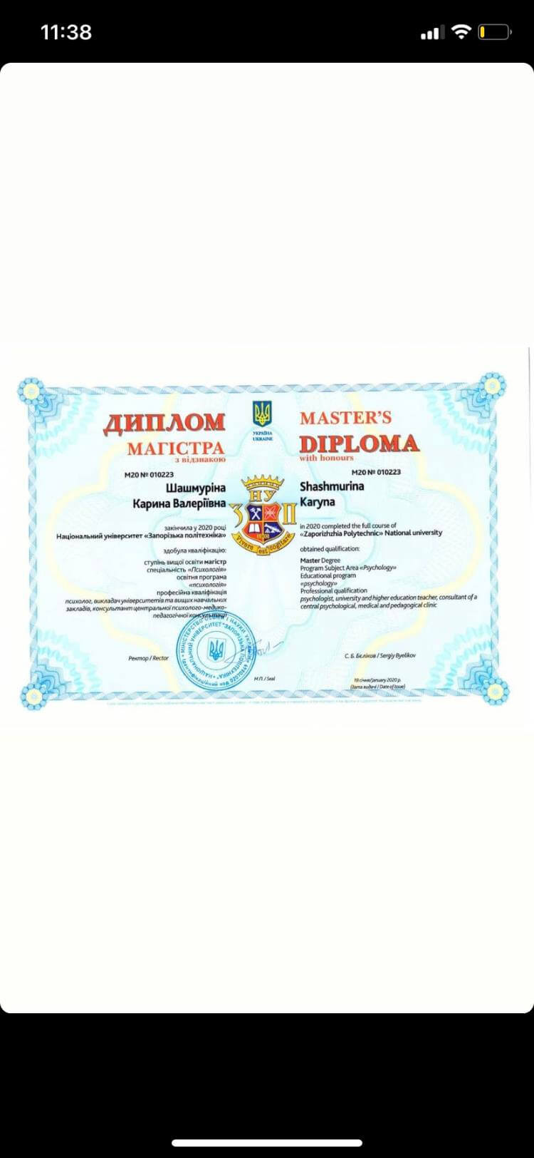 2. Диплом бакалавра з психології Запорізького національного технічного університету;