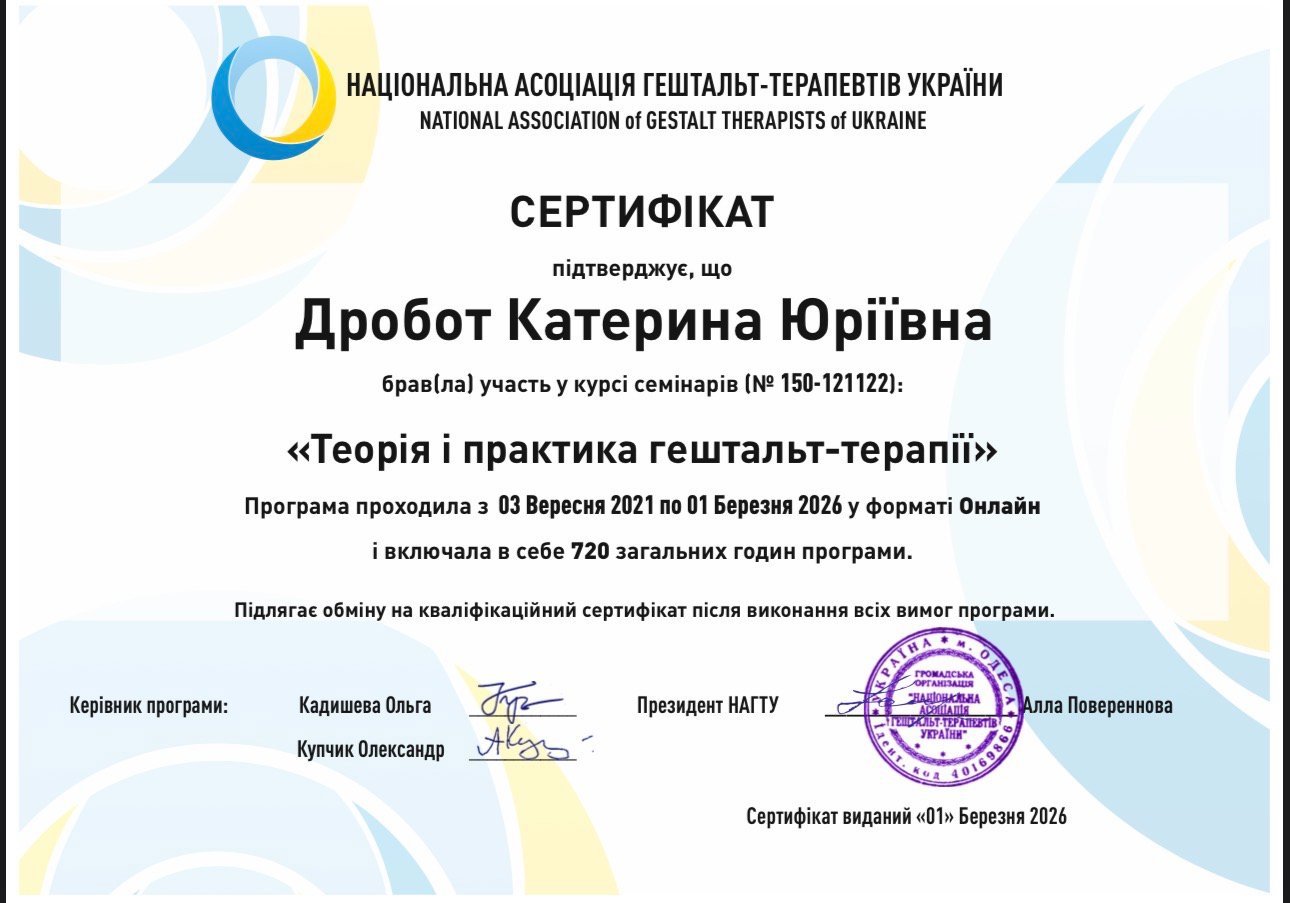 Сертифікований гештальт-терапевт у Національній асоціації гештальт-терапевтів України.