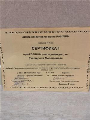 Доброго дня! Мене звуть Катерина Мартишева, я сертифікований сімейний консультант, психотерапевт, щаслива дружина та мама двох дітей.