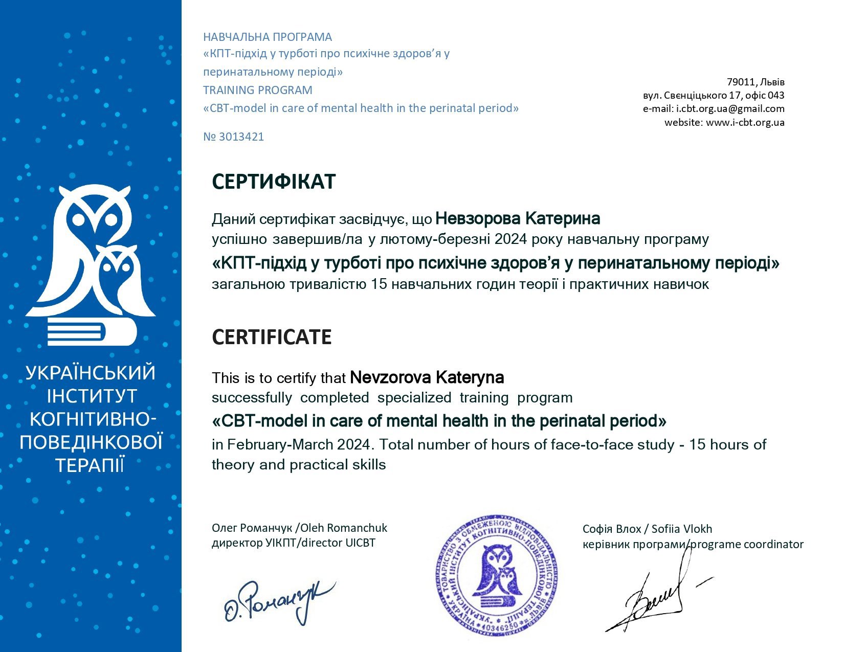 Навчальна программа "КПТ-підхід у турботі про психічне здоров'я у перинатальному періоді" (2024);