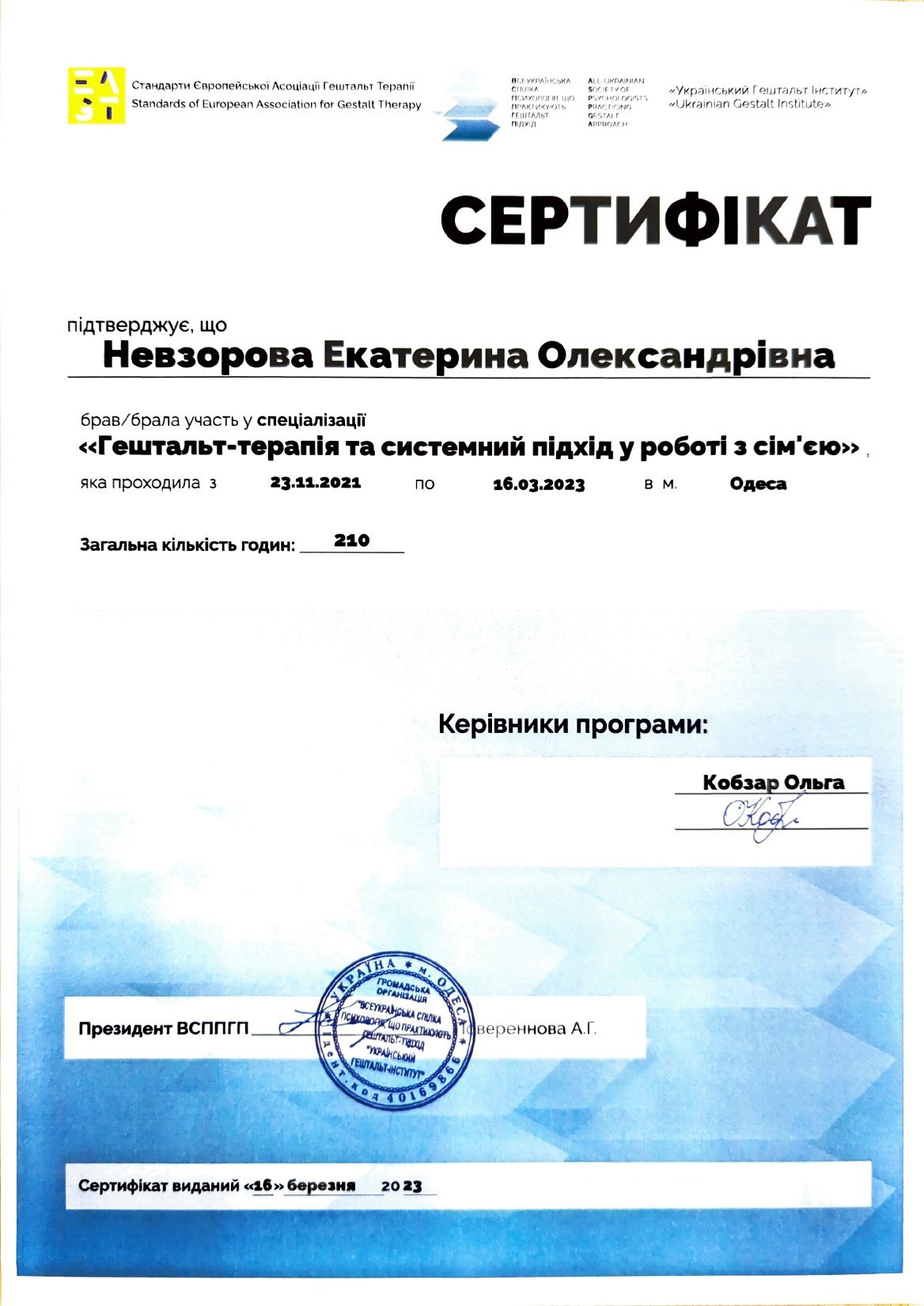 Спеціалізація "Гештальт-терапія та системний підхід у роботі з сім'єю" (2021-2023);