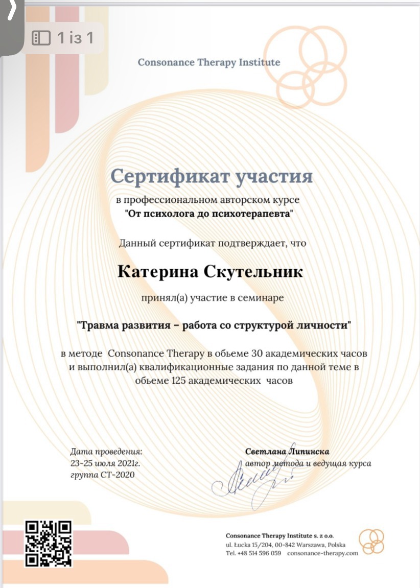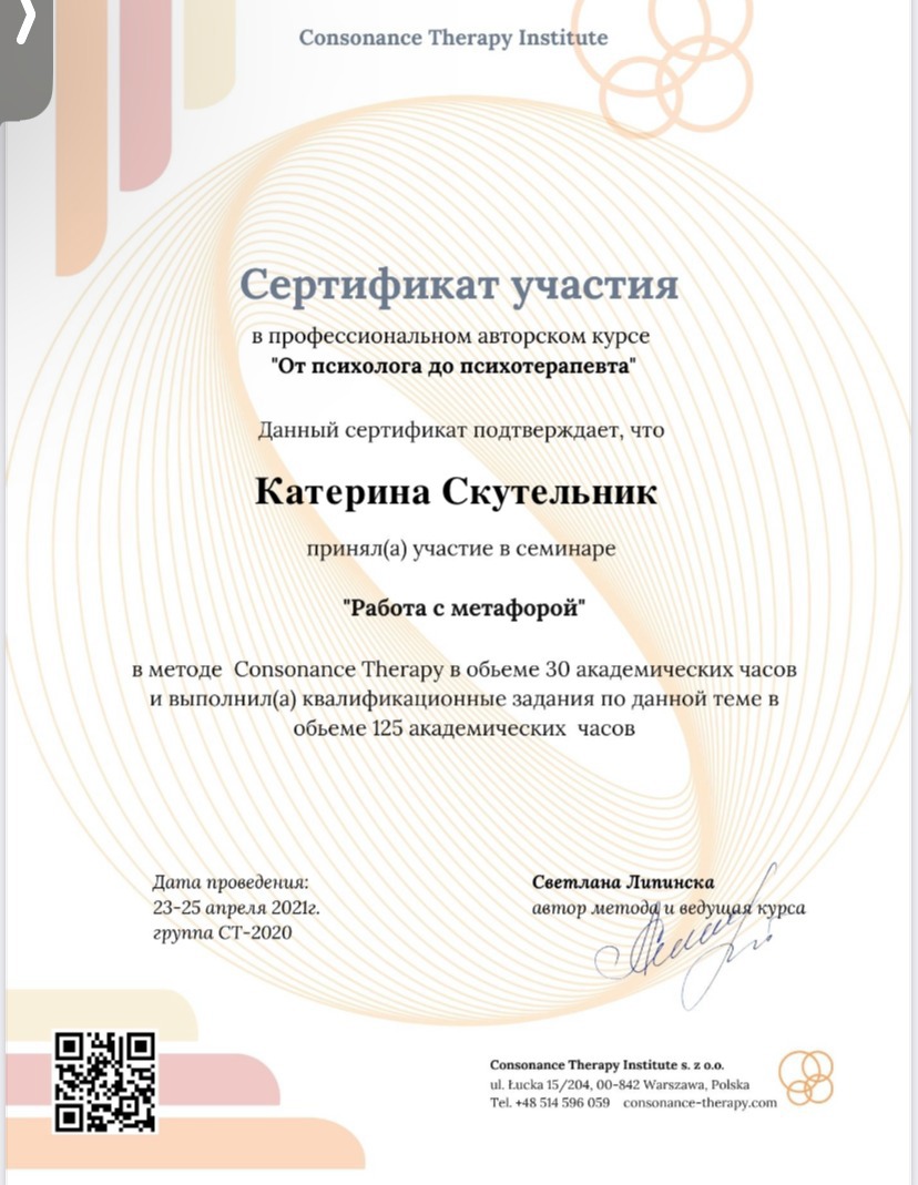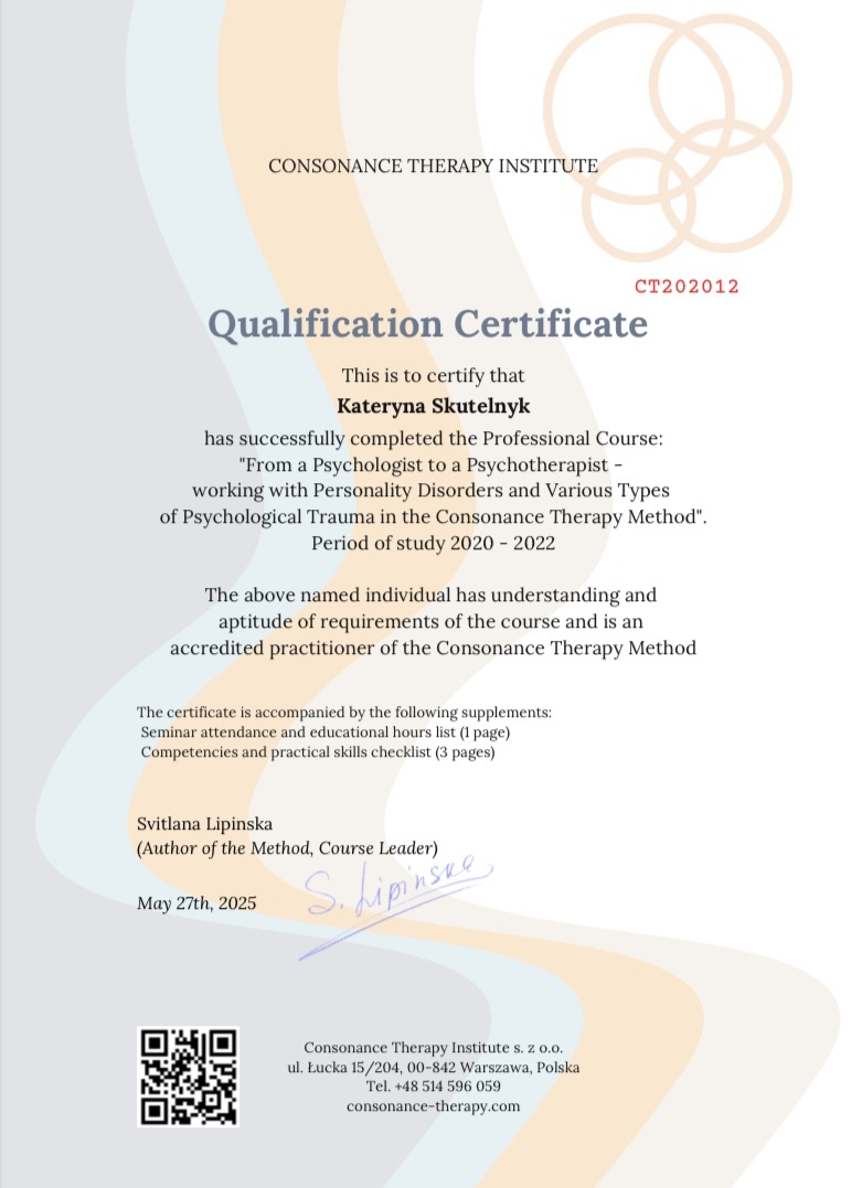 Я більше 10 років в психотерапії, маю вищу психологічну освіту і володію двома психотерапевтичними методами. Я багато навчалась і продовжую розвиватись, наприклад, зараз здобуваю ступінь супервізора. Також маю досвід проходження власної терапії і регулярну супервізію.