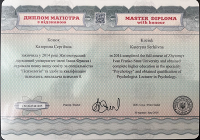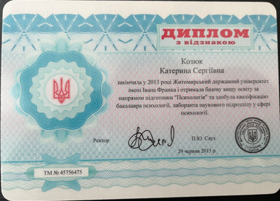 Закінчила Житомирський державний університет ім. І.Франка та отримала кваліфікацію "Психолог.Викладач психології"