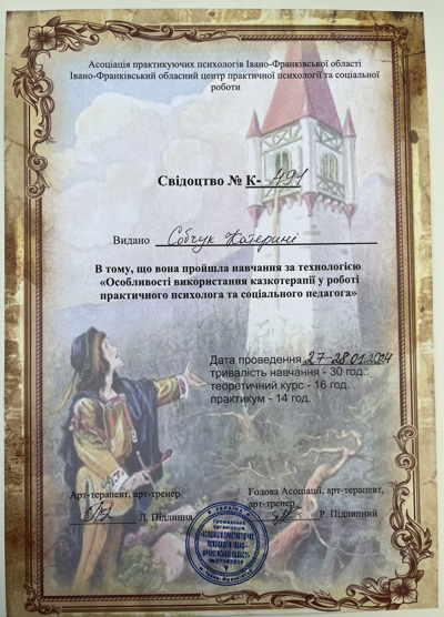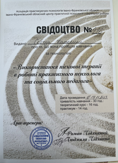 У своїй роботі я використовую техніки когнітивно-поведінкової терапії (КПТ), майндфулнес, арттерапію, мотиваційне консультування, що дає можливість знайти індивідуальний підхід до кожного клієнта.