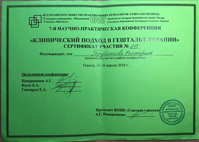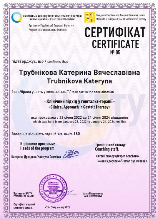 Завершені спеціалізації “гештальт терапія в роботі з гендерною ідентічністю, парами та подружніми парами”; спеціалізація “клінічний підхід у гештальт терапії”